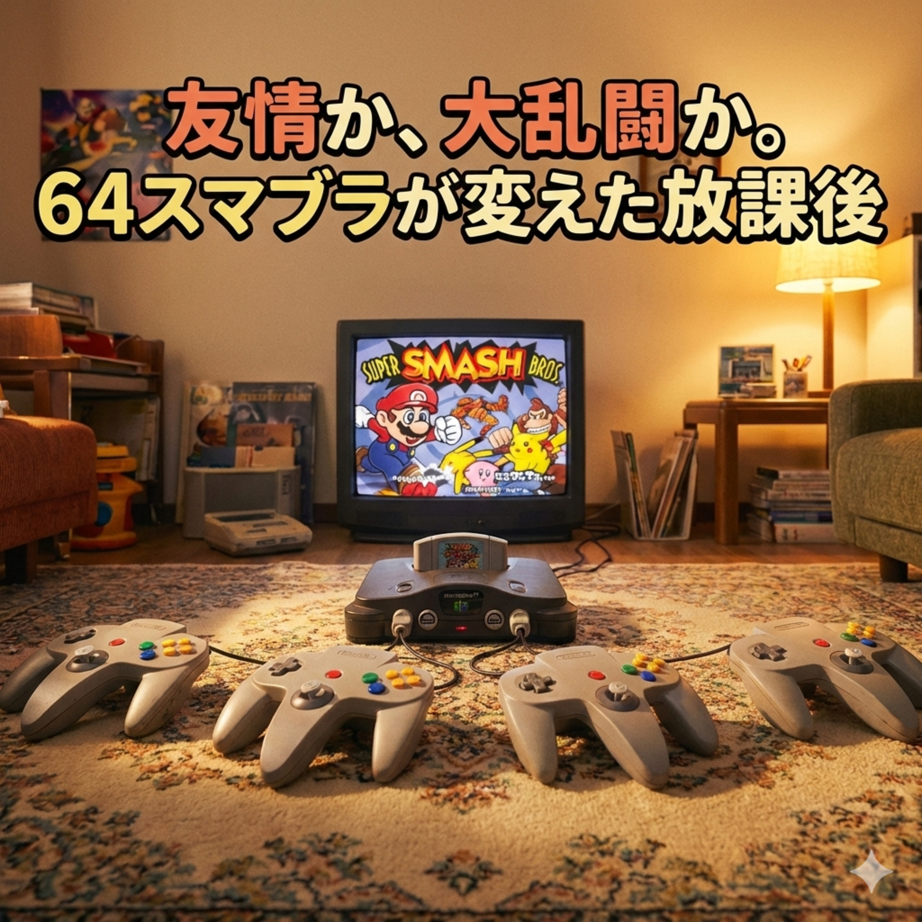 周辺機器なしで4人対戦ができた64本体の革命的な仕組みから、カービィやドンキーコングといったキャラクターごとの絶妙な特性の違い、そして熱くなりすぎて現実の世界でも勃発してしまった「リアル大乱闘」の思い出まで。
