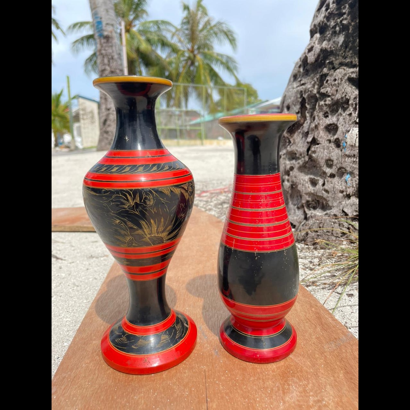 「ラージェフン」は、モルディヴ伝統の漆細工で鮮やかな朱色の赤に黒とゴールドの配色が特徴的です。