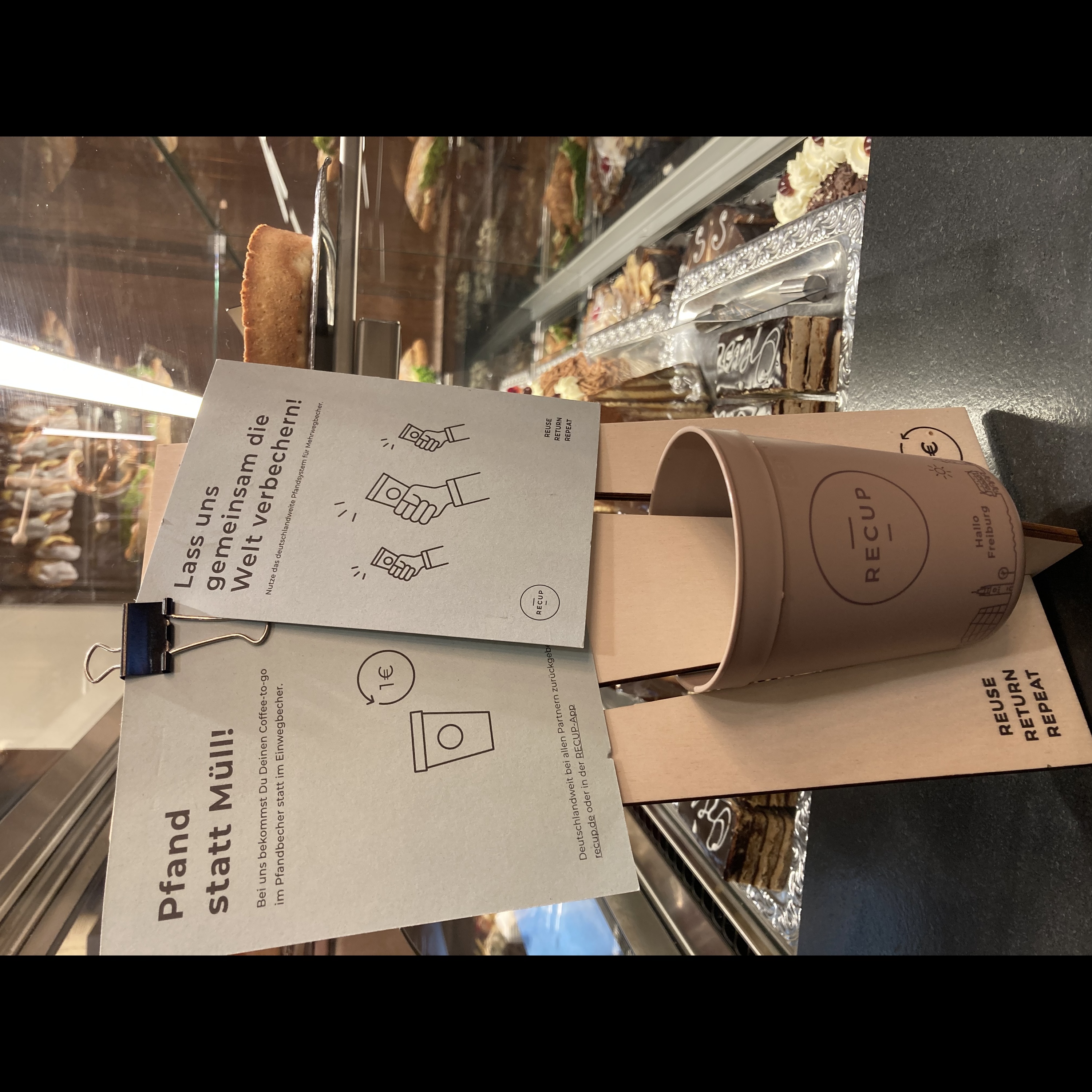 環境意識の高いフライブルクのカフェでは、Re Cupの取り組みが行われ、持ち帰り専用のカップをコーヒー購入時に選択することができます。