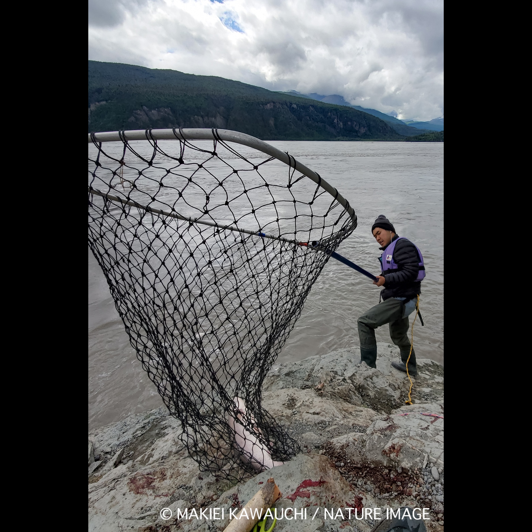 長さおよそ2、3メートルの柄の先についた、5フィート、およそ直径1.5メートル以内と定められたディプネットと呼ばれる大きな網で遡上してくる鮭をすくい上げるフィッシングです。
