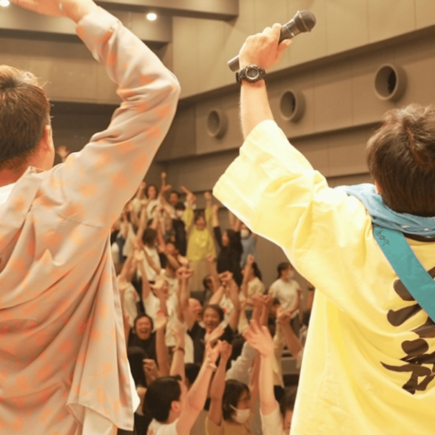 ちょびっとだけ遅くなっちゃったんですけども。 こちらですね右側の黄色いのが私ですね。左側にいるのが大島圭介さんですね。