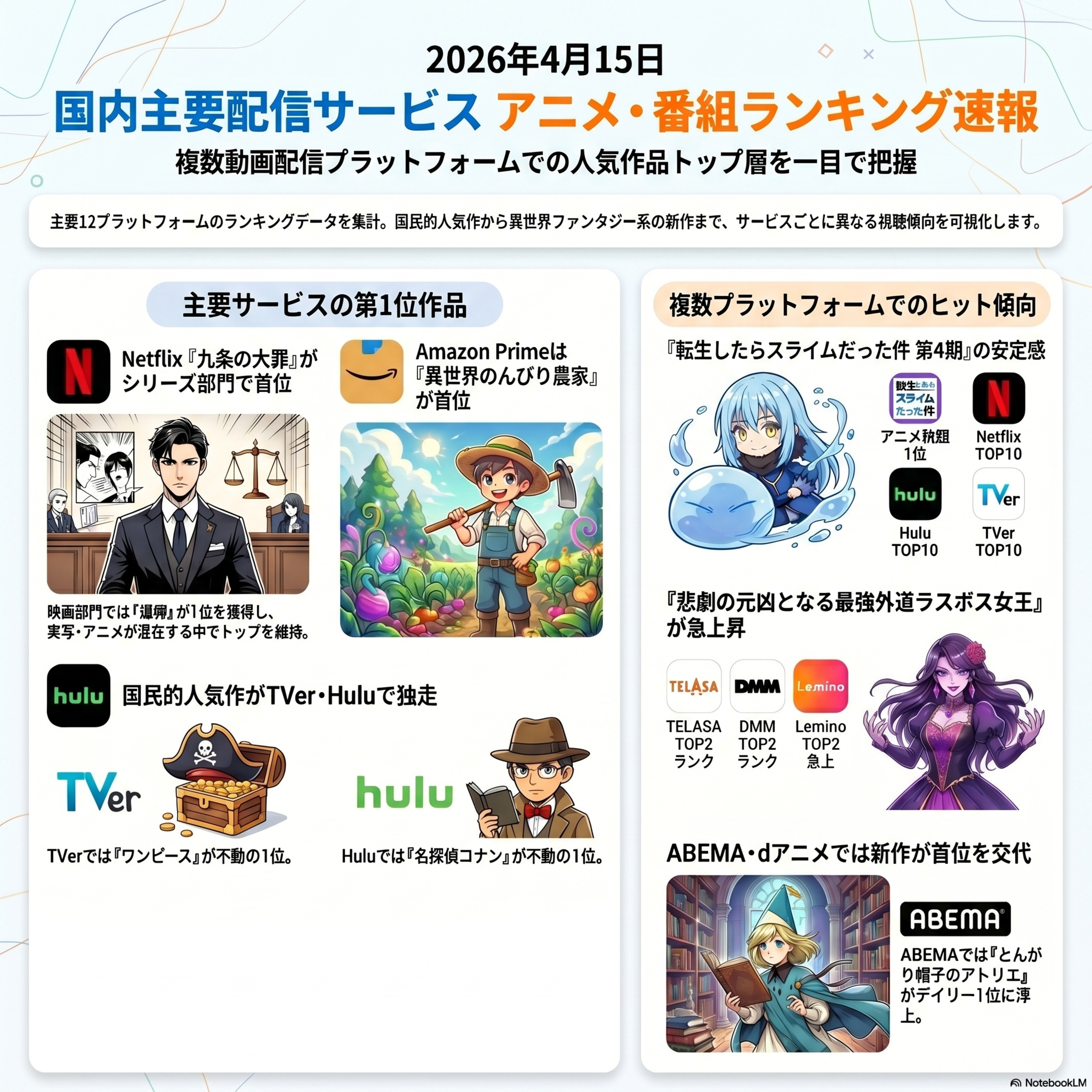 今何が流行っているかを知るために、なんと全12サービスの2026年4月15日の上位10作品を今から一気に読み上げていきますよ。