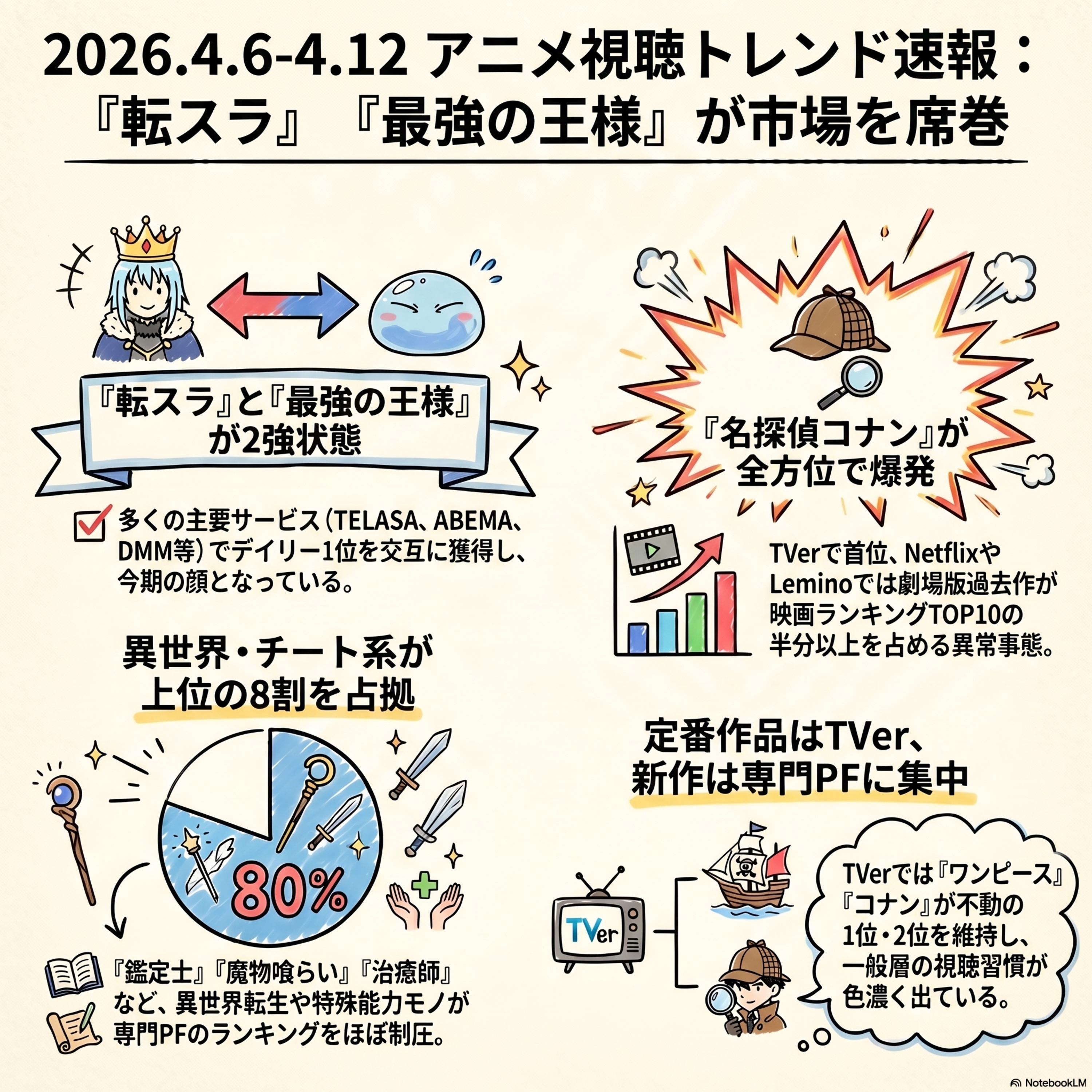 2026年4月第2週のアニメ視聴ランキングデータを徹底分析。同じ「日本のアニメファン」が見ているはずなのに、TVer、ABEMA、バンダイチャンネル、レミノといったプラットフォームごとに、なぜこれほどまでにランキングの結果が異なるのか。その謎を解き明かします。