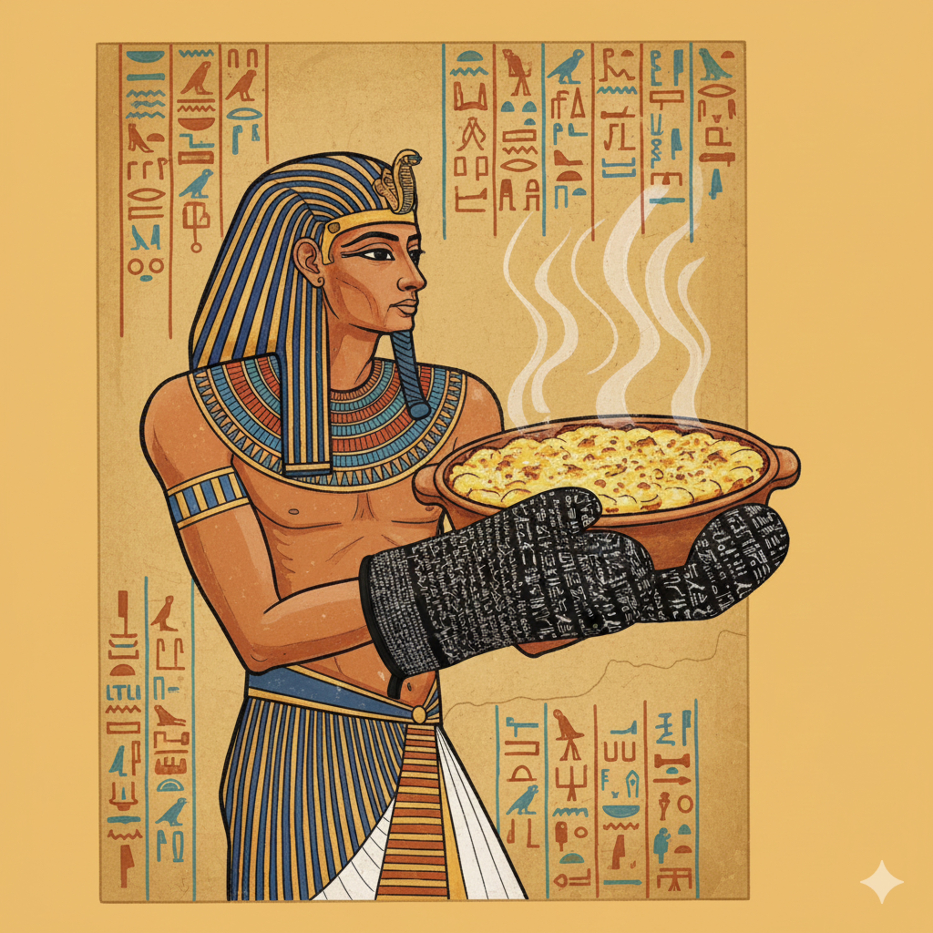 このヒエログリフとか書かれているミトンですけども、 これでオレはグラタンを触ってもいいんだぞというふうにね、思えるというところが、