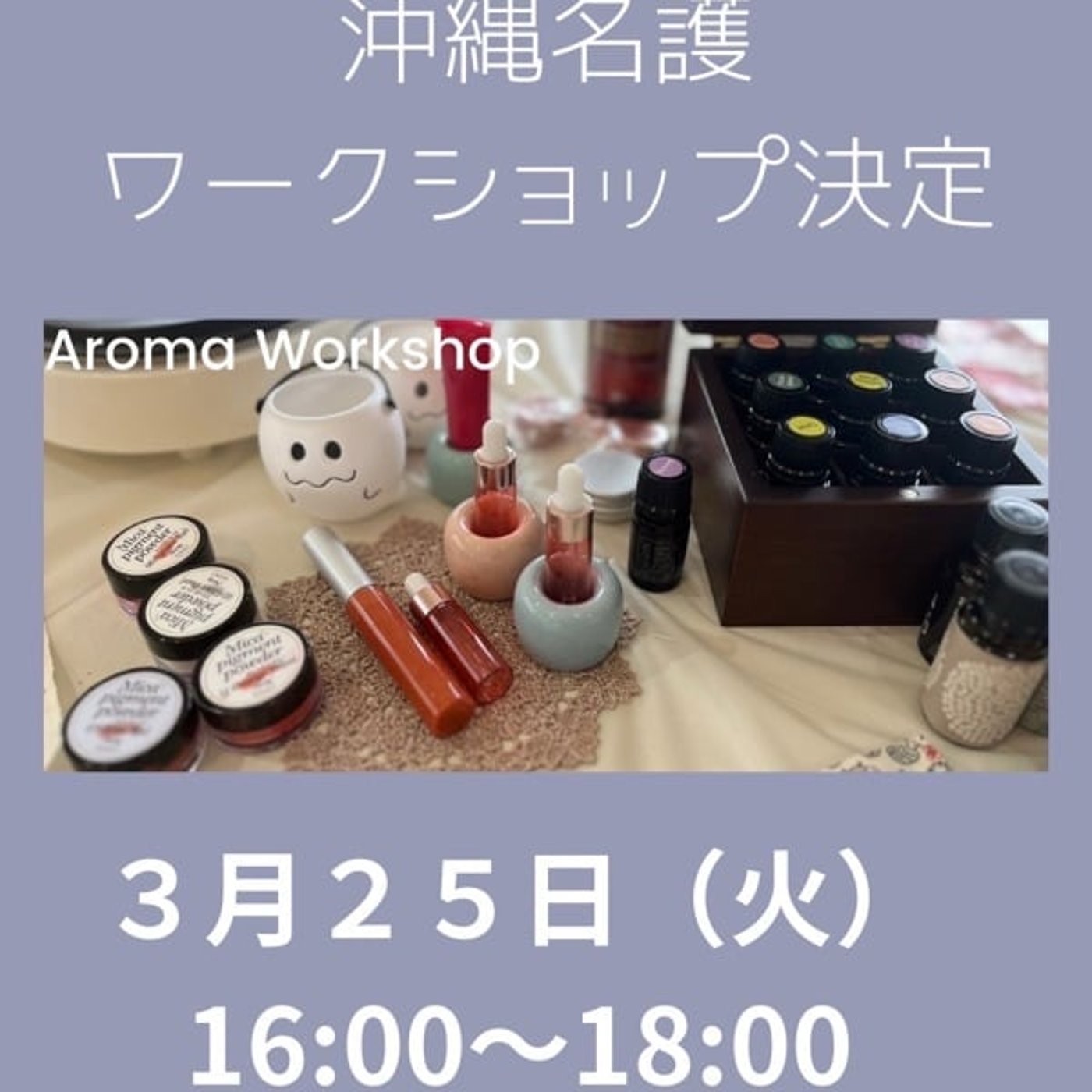 名護周辺の方でね、ちょっとねアロマ気になるのとかね、使ってみたいのとかね、あとこういうねワークショップ体験したいのとかね、私にやってみたいのっていう方もぜひいらっしゃったらもう気軽にプラッと来てください。