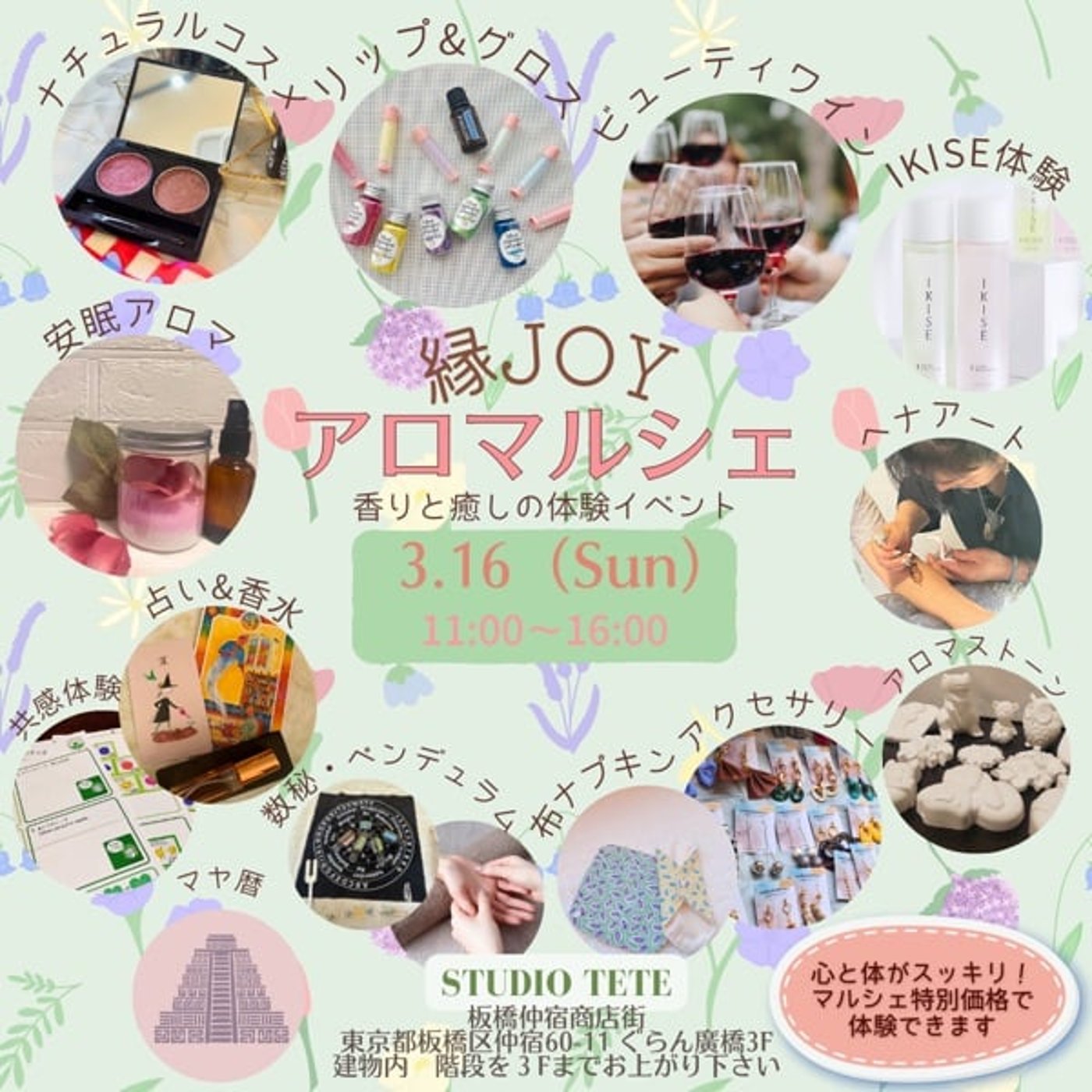 アロマと毒意を掻き合わせた心と体に優しい癒しの体験がたくさんできるマルシェになっています。