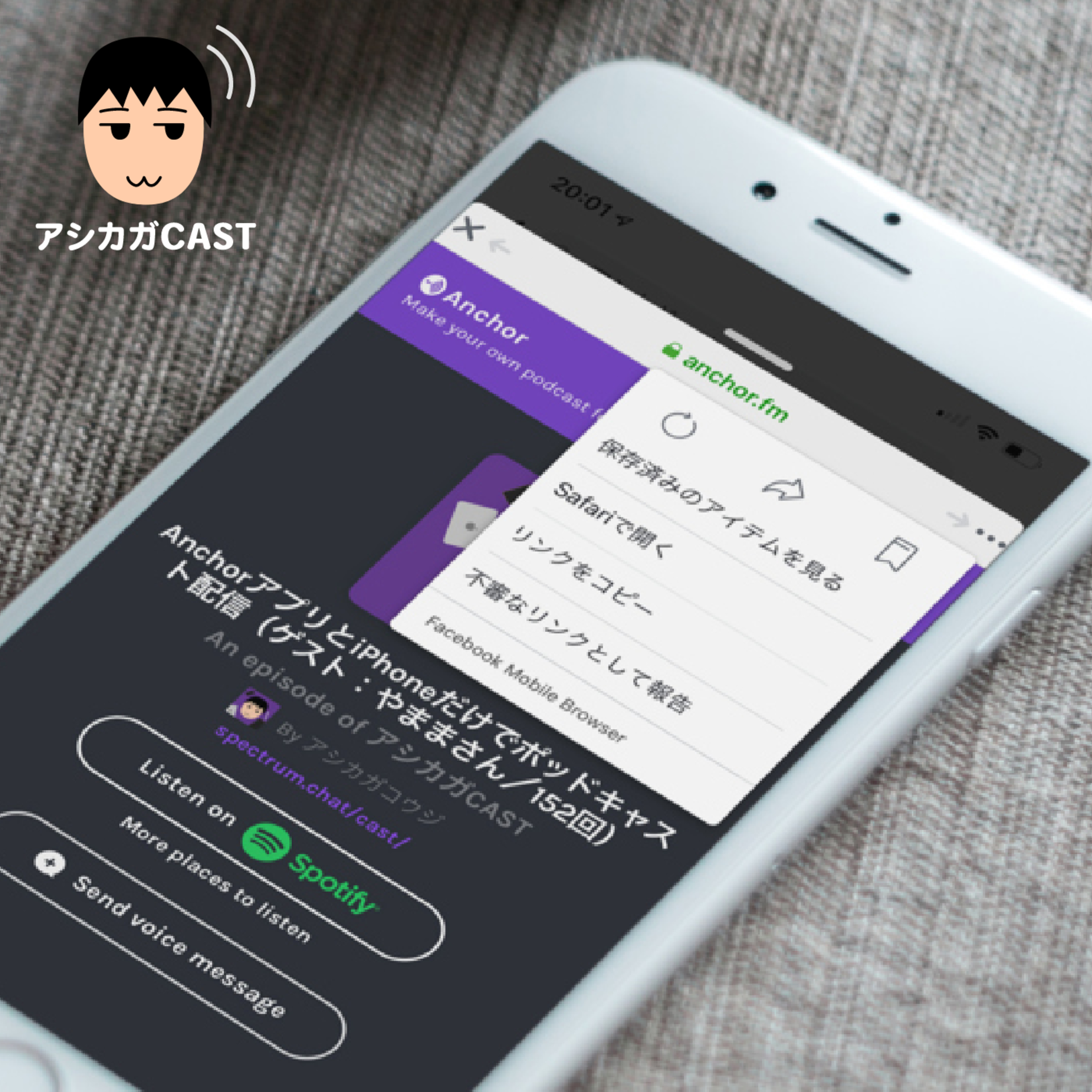 iPhoneのFacebookアプリ内のリンクからAnchorページを開いてポッドキャストを再生した場合、別アプリを使ったりスリープした時に、勝手に再生が止まってしまうことがわかりました。