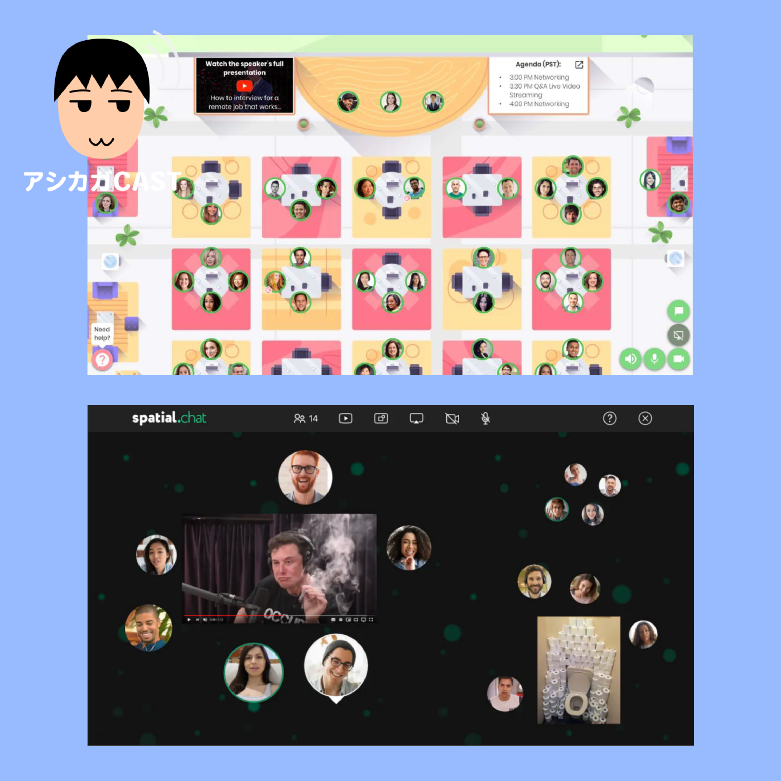 部屋(テーブル)に分かれてビデオチャットができるRemoと、画面内で場所が近い人とビデオチャットができて遠い人の声も小さく聞こえるSpatialChatを紹介しました。