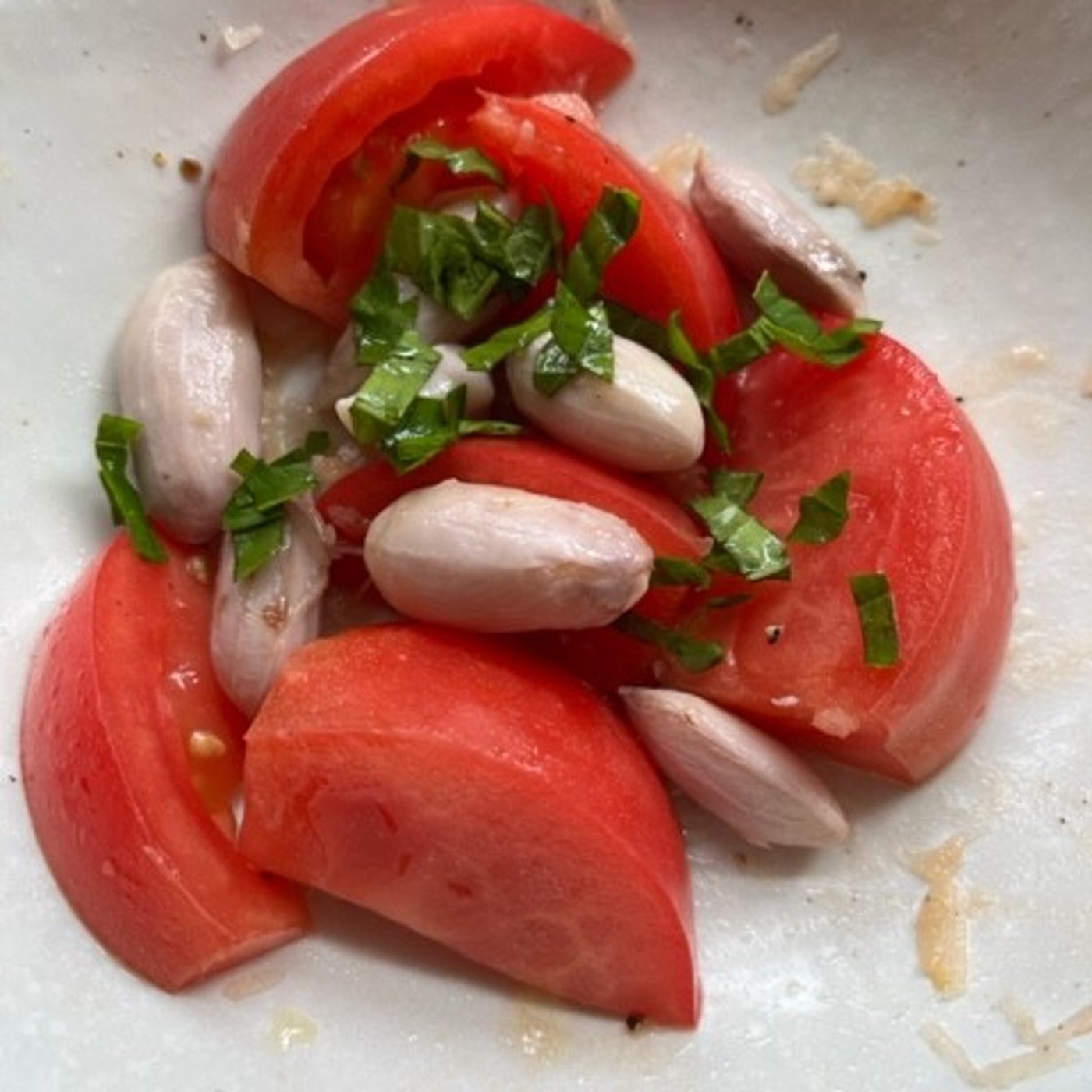 えっと、今手元にはトマト10玉ぐらいかな。と、ニンニクと塩コショウとオリーブオイルあります。