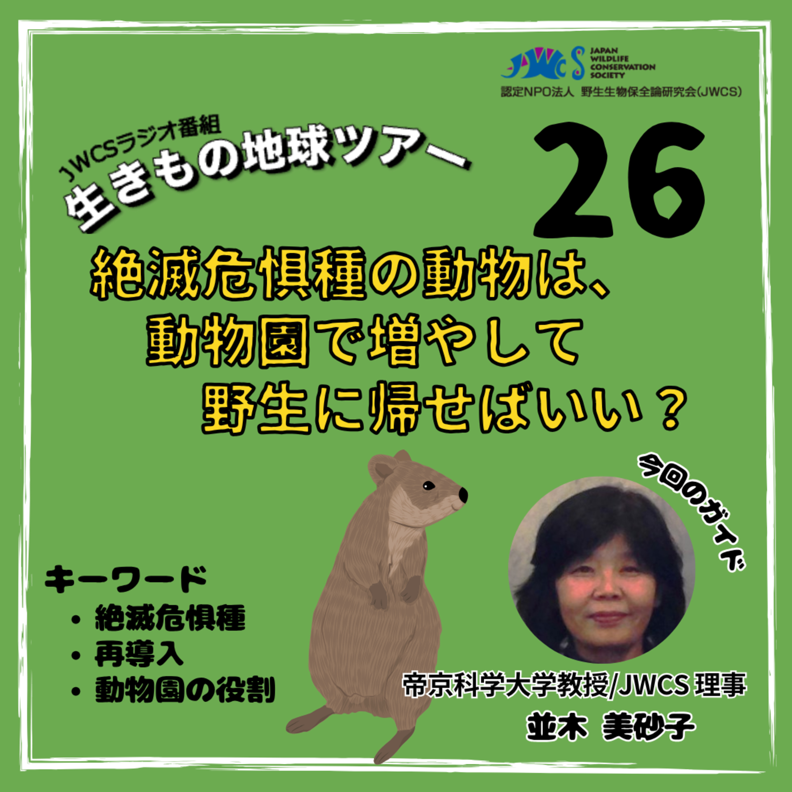 今回は、絶滅のおそれのある動物を動物園で増やして野生に帰せば、絶滅は防げるのでは?という質問についてです。モンゴルで1960年代に絶滅したとされたモウコノウマや、オーストラリアの固有種のクオッカの例で考えてみます。【ナビゲーター】齋藤美希 (JWCS 事務局スタッフ)