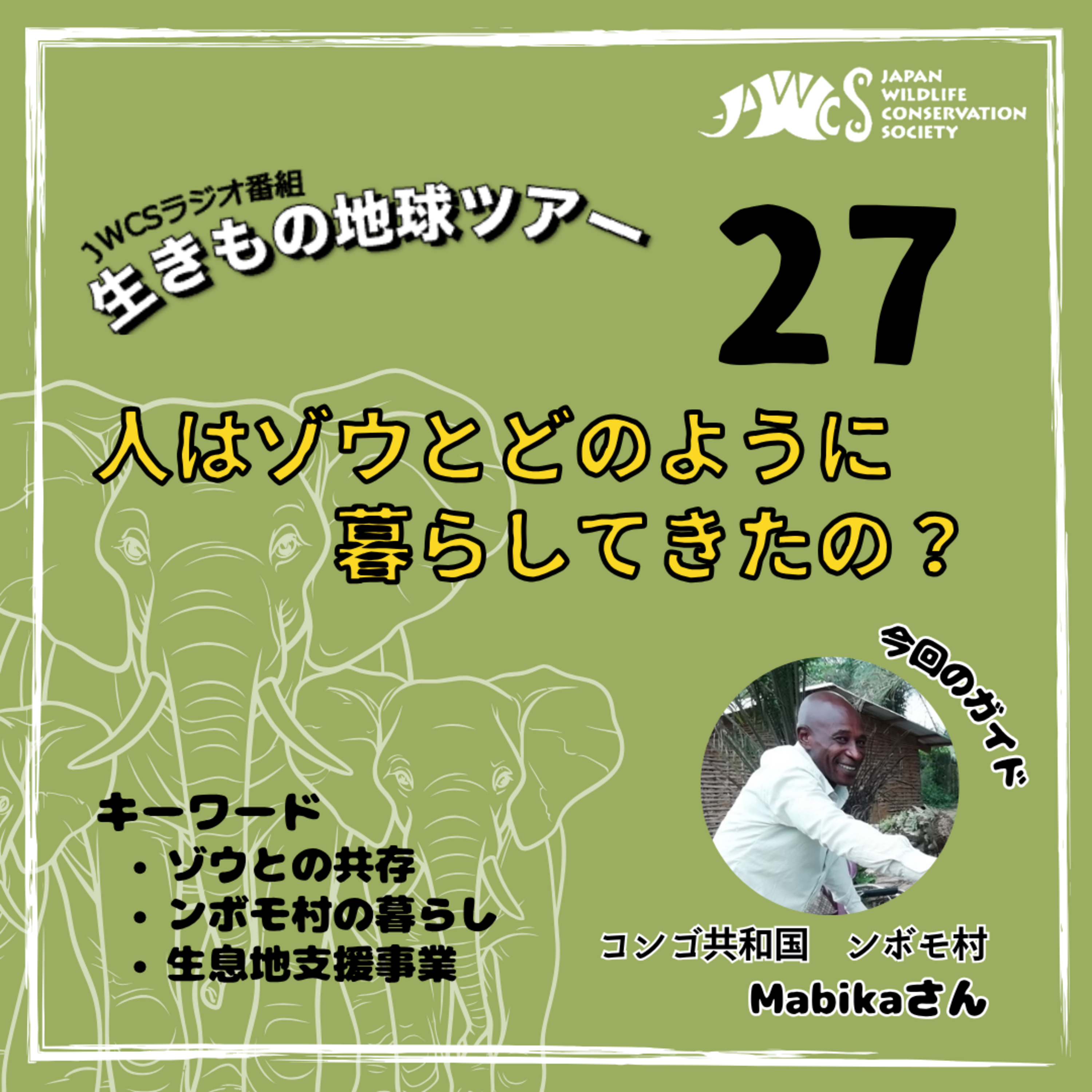 今回は、今年9月に世界遺産に登録された、アフリカ・コンゴ共和国オザラ・コクア国立公園の入り口があるンボモ村のお話です。JWCSは、村人がゾウと共存できるよう、ンボモ村で生息地支援プロジェクトを行っています。8月にJWCS事務局長の鈴木が現地を訪れ、村人のマビカさん(58歳)に、ゾウと人がどのように暮らしてきたか、インタビューしてきました。