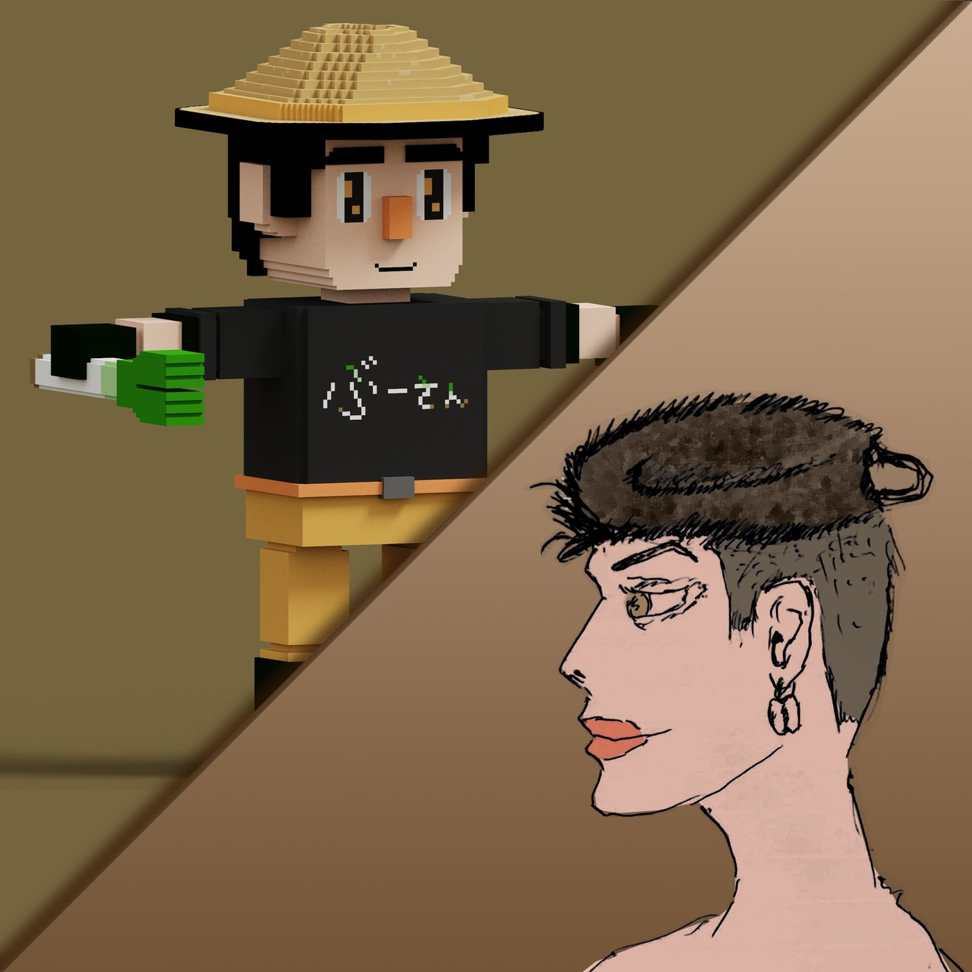 農家の格好で手にネギ持ってて、他の人とは異色な感じがするので、