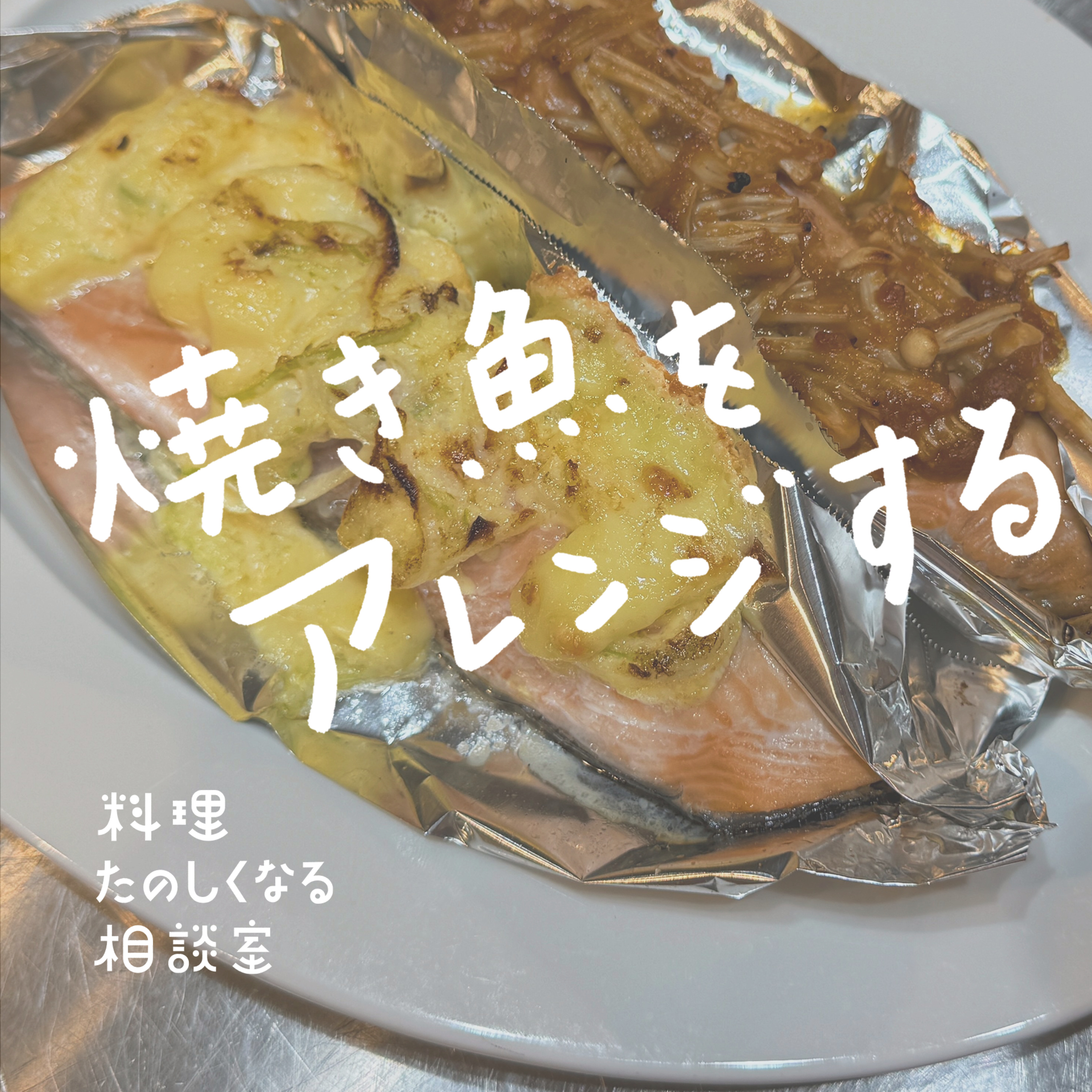 …ということで、今回は焼き魚のアレンジのお話。まずはさまざまなお魚(丸のまま、切り身など)のバリエーションについて。そして鮭の切り身を使って実践していきます。いろいろな具材を載せていきながら、どんな具材や調味料が合うのか、などいろいろお話ししています🐟