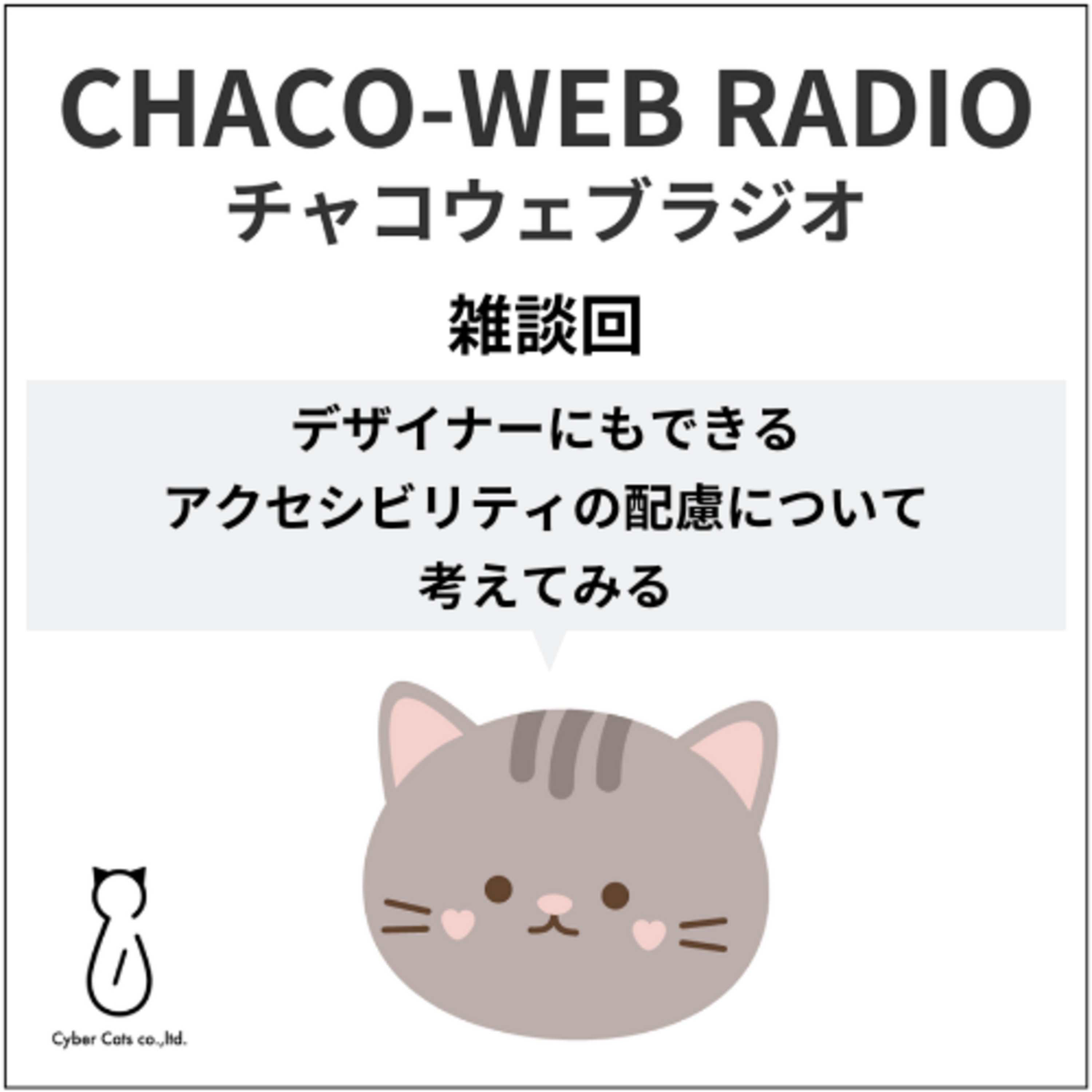 「チャコウェブラジオ」は株式会社Cyber Catsが運営するチャコウェブのスタッフが、ウェブアクセシビリティを実践したい制作者やウェブ担当者に向けて、ゆっくりじっくり解説していくポッドキャストです。