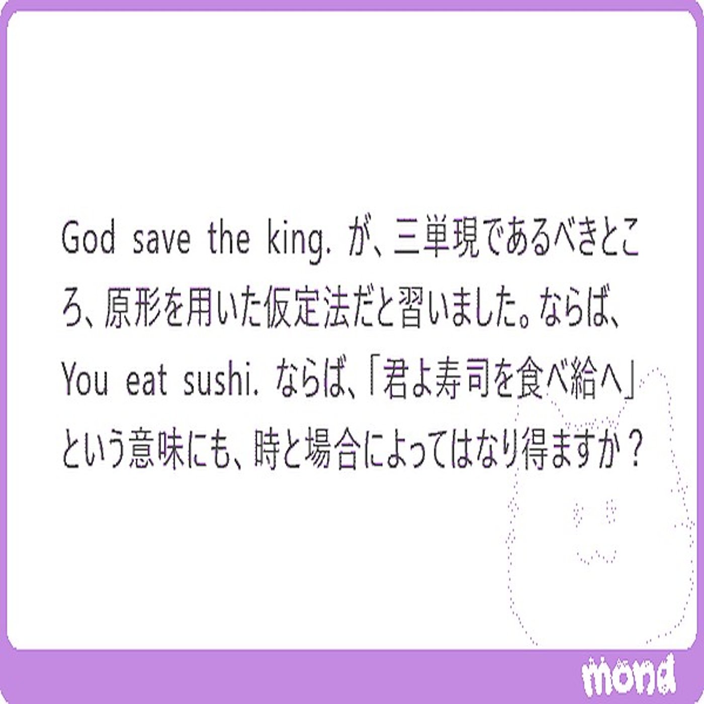 そこでたくさんのですね、この寿司文と今日読んでおきたいと思うんですね。You Eat Sushi をどういうふうに解釈するかっていう、いくつかの読み方があるんだというような話題になってくるので、寿司文と読んでいきたいと思いますが、このモンドの記事、それから X 上での告知に対してですね、本当にたくさん今のところでもですね、リプライいただいているんですね。