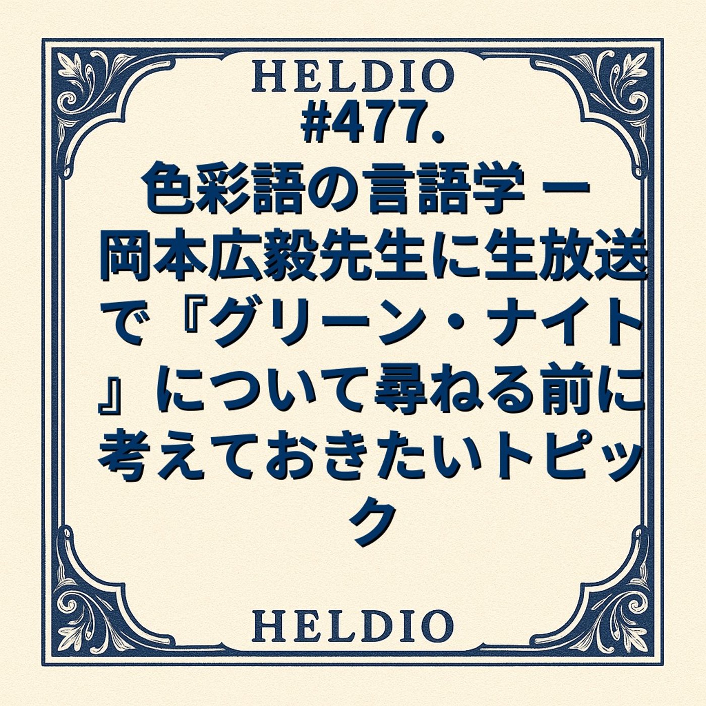 岡本広毅先生に生放送で、グリーン・ナイトについて尋ねる前に考えておきたいトピック、 という長いタイトルなんですけれども、色彩語、色を表す言葉の言語学を紹介したいと思うんですね。