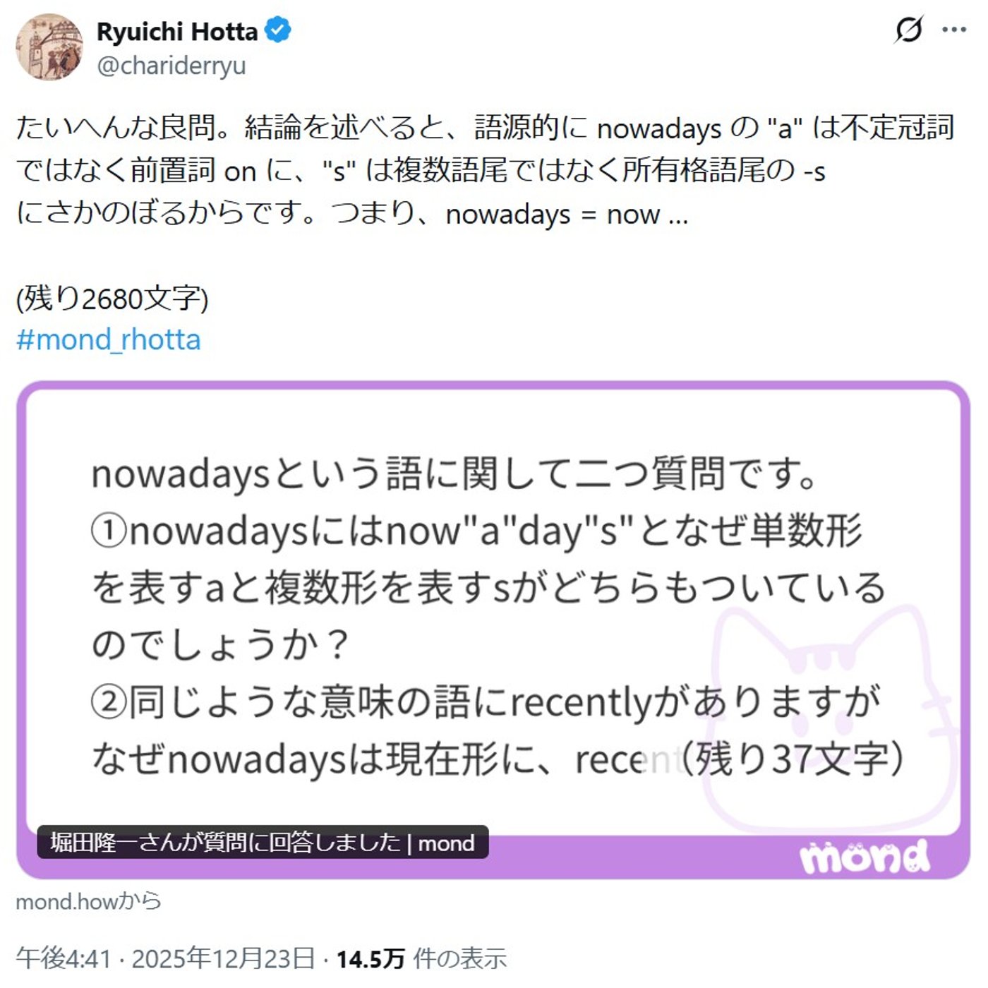 さあ、クリスマスとしては非常に静かなんですけれども、 2日前、23日にモンドで回答しました。