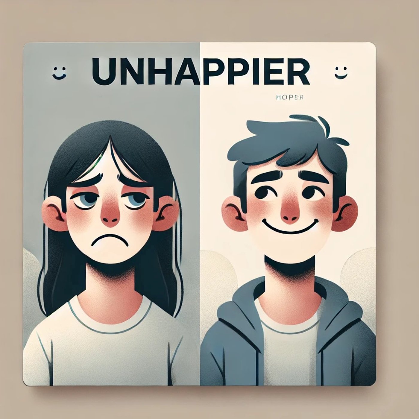ところがですね、ハッピーにまずERをつけてハッピーアとする、よりハッピーである。これを否定するアンという形であればですね、よりハッピーであるというわけではないという意味になって、我々が知っている常識的に考えるアンハッピーアの意味とはちょっと異なってくるんです。