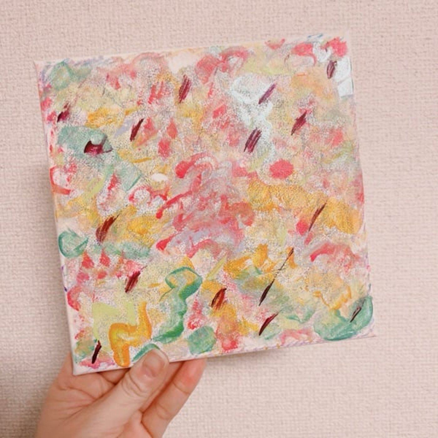 で、クレヨンで描いたものを包むように塗ってくださいねって、ひろこさんはおっしゃるんですね。で、塗ってから、アクリル絵の具で今度また好きなように筆を使ったりとか、バターナイフみたいなのを使ったりとかしながら、また作品を仕上げていくんですけど、