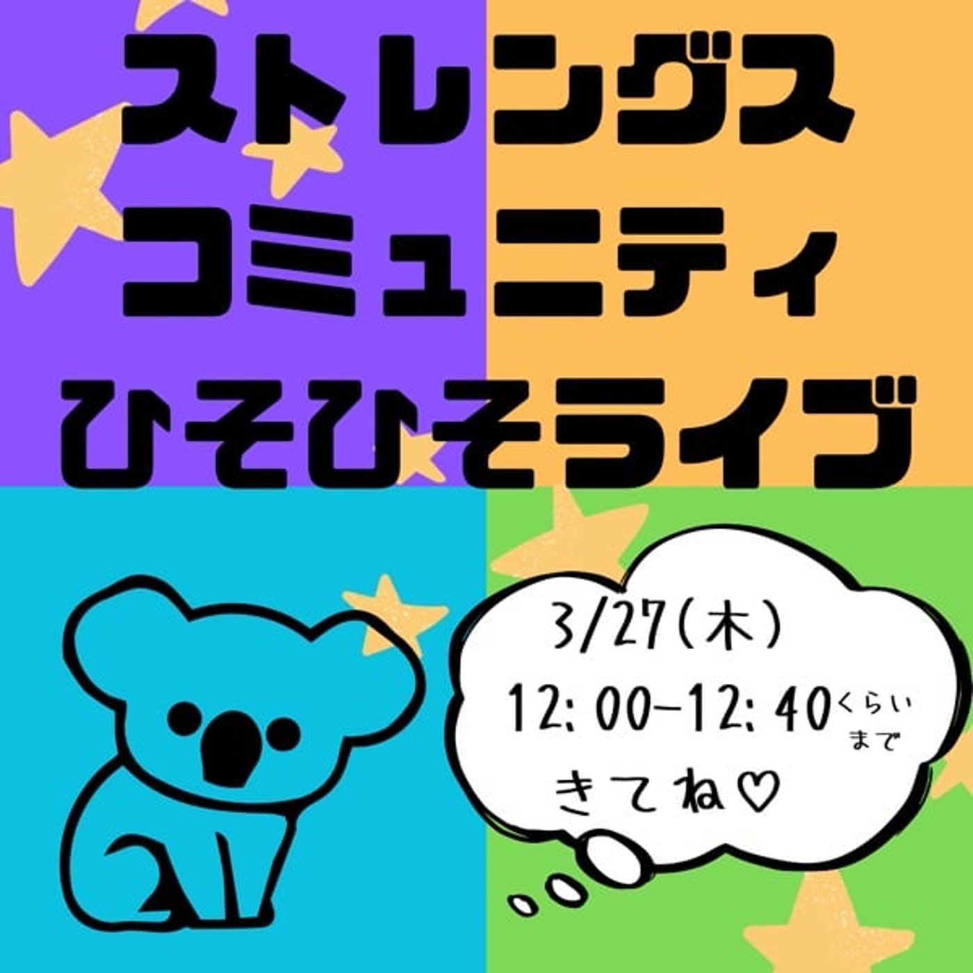 あー遅くなっちゃった。すみません、よろしくお願いします。ストレングスひそひそ…違った、ストレングスコミュニティひそひそLIVE🐨です。