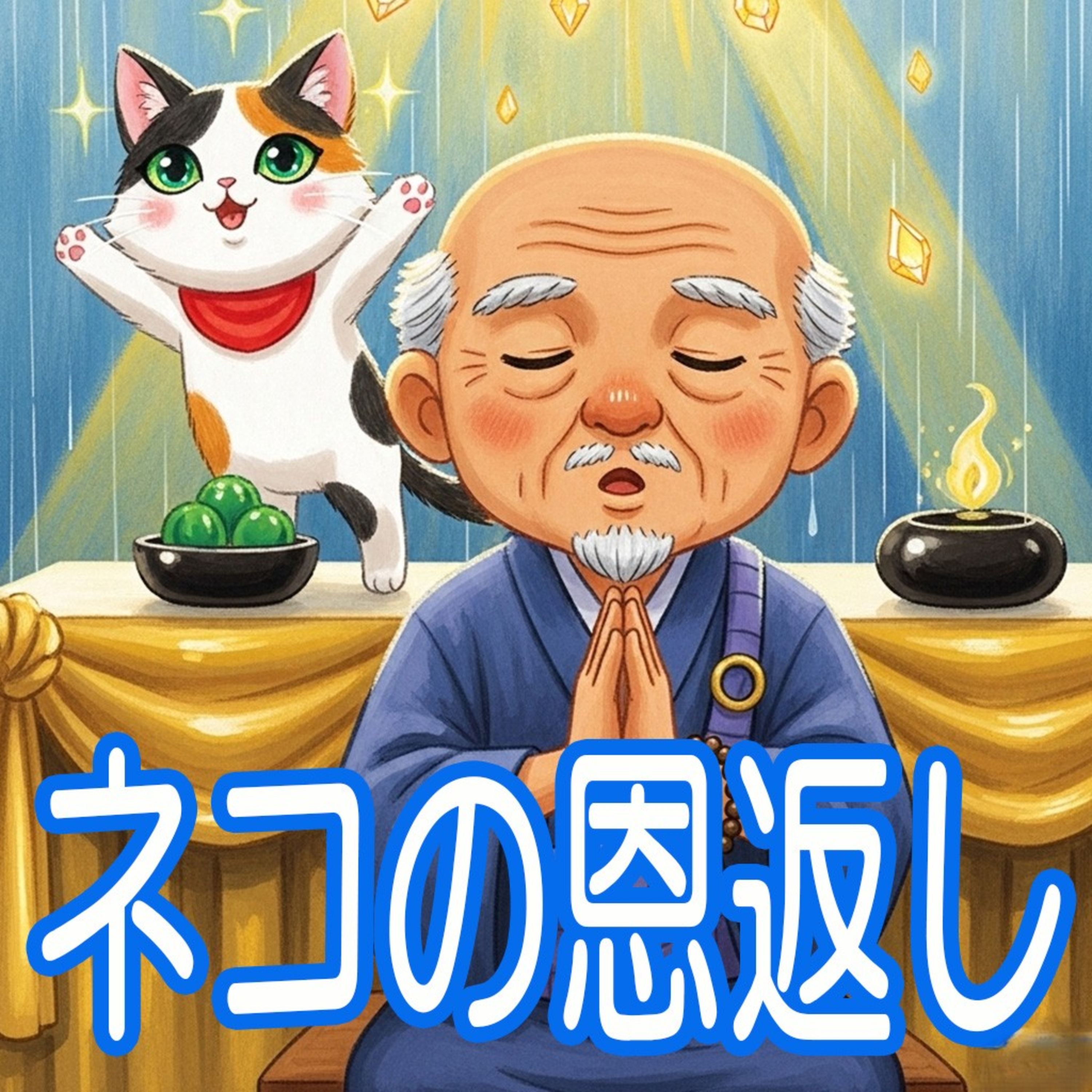 貧乏寺の和尚さんと三毛猫はとても仲良し。