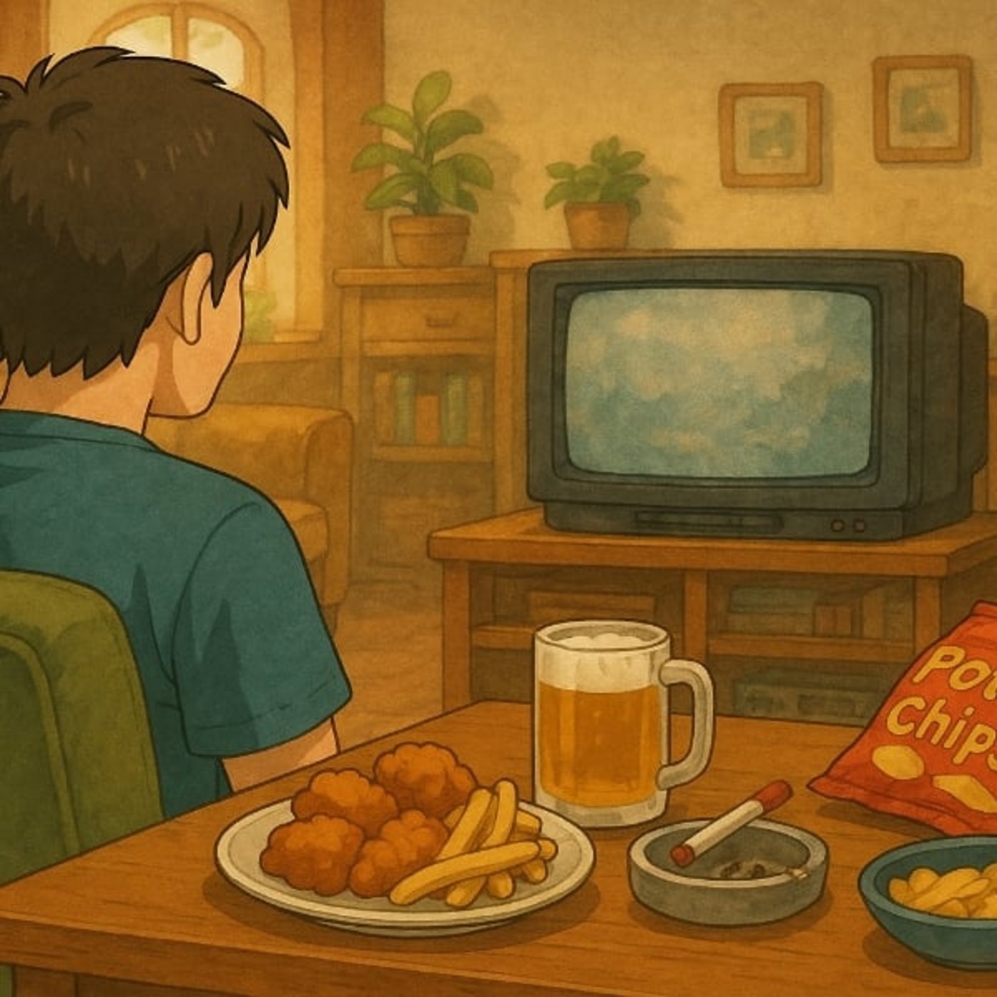ソファの前に酒とジャンクフード