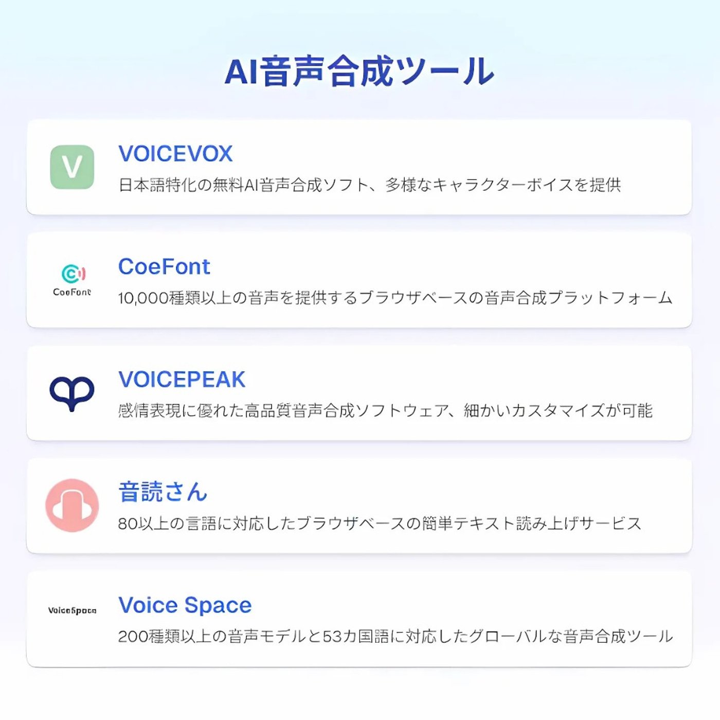コピーしたのをペタリと貼って、以下はAIを活用した音声合成ツールの一覧です。