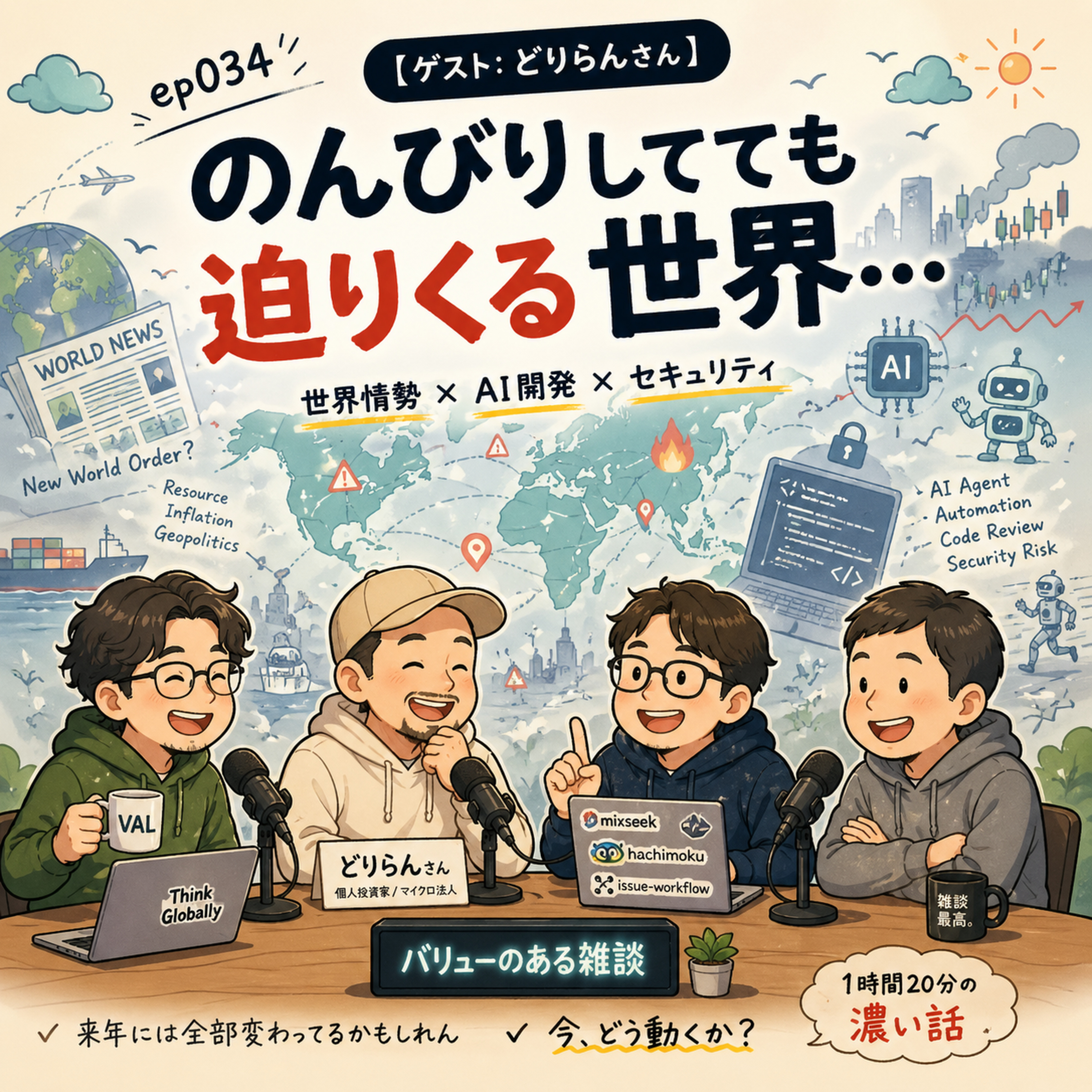 準レギュラー・どりらんさんが約10ヶ月ぶりに登場。貴金属トレーダーとしての視点から語る世界情勢の話から始まり、実戦投入中のAI開発ワークフロー、そしてセキュリティリスクの非対称性まで、実務に根ざした濃い話が続く1時間20分。「来年には全部変わってるかもしれん」という速度感の中で、今どう動くかを考える回。