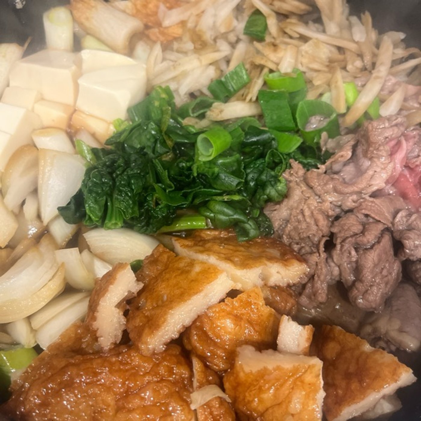 ですき焼きってなんか春菊とネギとなんか豆腐とか決まってるやつもぶっ壊してね。