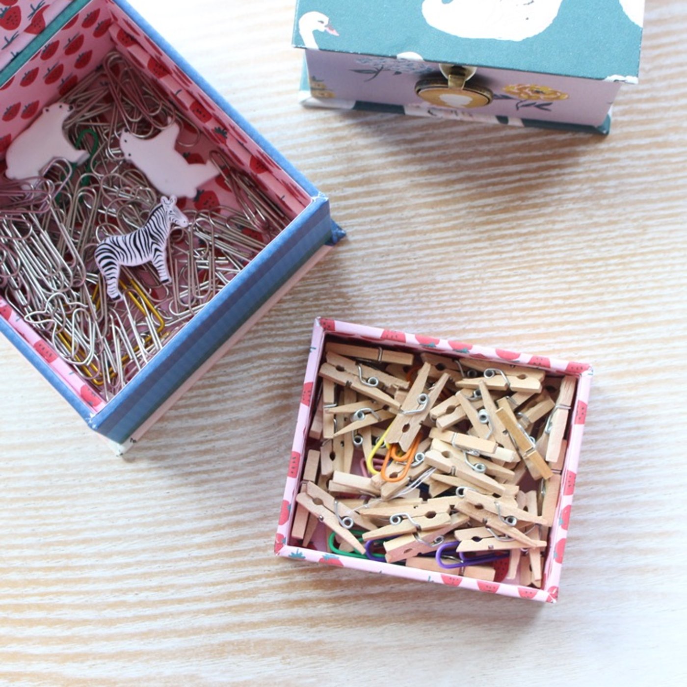 あと、厚みがあるものを止めたりするのに、このメタルのやつだと止まらなかったりするので、木製のちっちゃなクリップを入れているんですけれども、