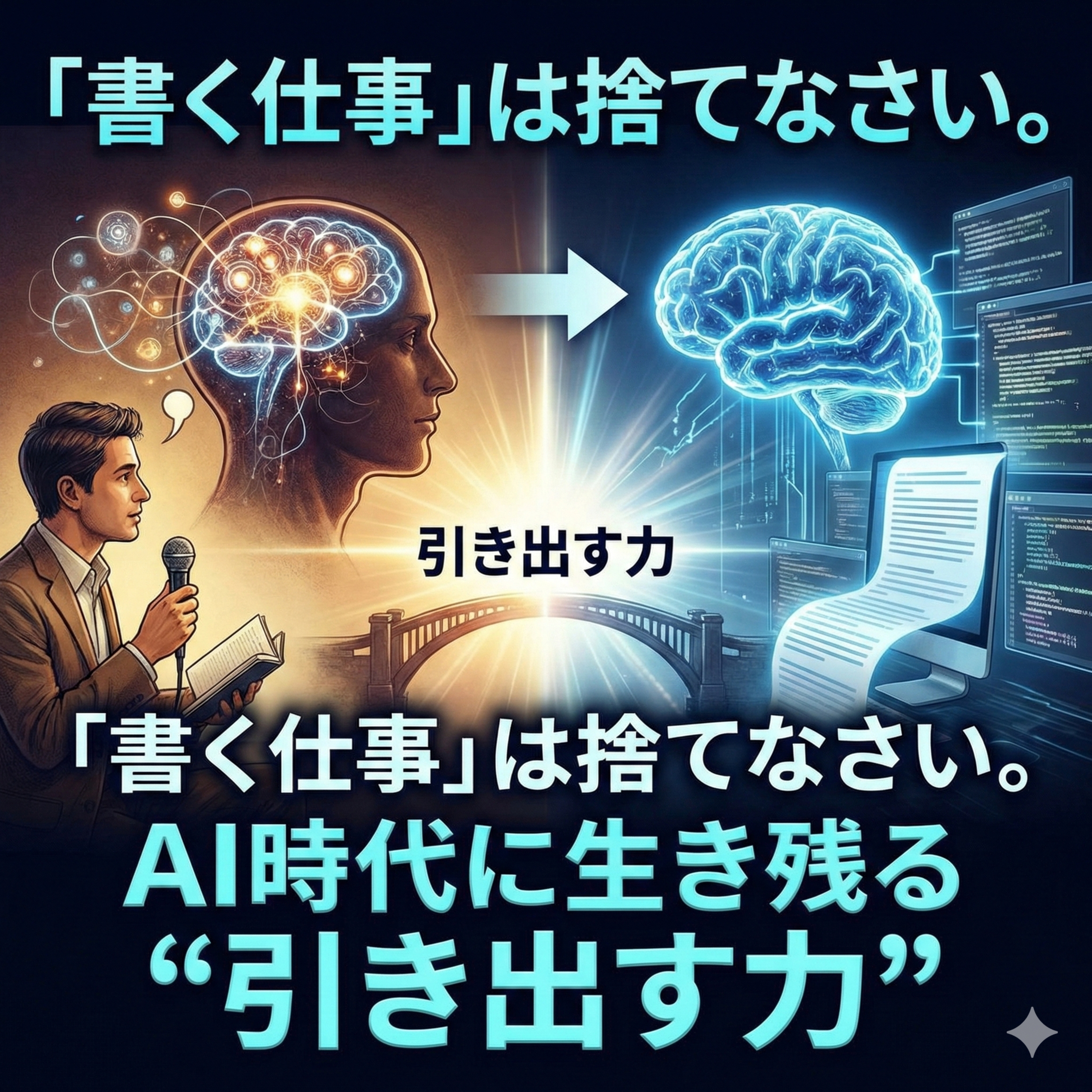 生成AIが普及した今、SEOや整った文章を書く「アウトプット」の価値は暴落しました。しかし、AIには絶対にできない領域があります。それが、クライアントの脳内にある“まだ言語化されていない物語”を掘り起こす「引き出す力(インタビュー力)」です。