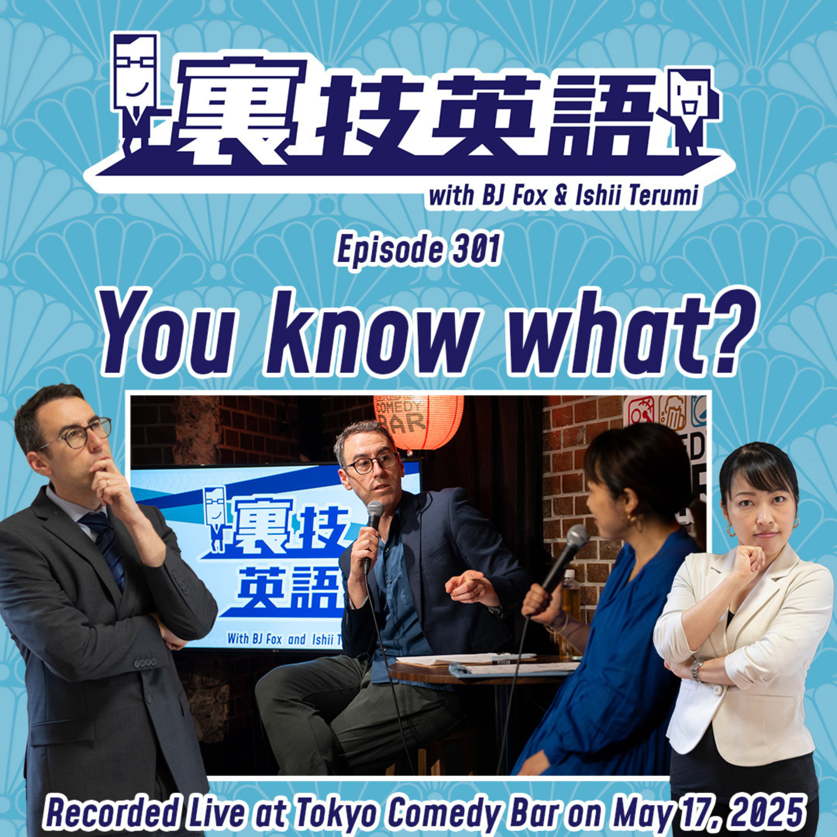5月17日(土)に渋谷Tokyo Comedy Barで行われた300回記念パーティー&公開収録から!今週から2回に渡って取り上げるフレーズは"You know what?"です。BJが普段話しているとあまりに自然に口をついて出てくるので、もはや何を意味しているのか混乱しているという頻出フレーズ。改めて整理をすると①大事なことや強い意見を言うとき②意見を改めるときや考えが変わったとき、の大きく2つのシチュエーションで前置きとして使われています。日本語だとどんな訳がしっくり来るか、ぜひ一緒に考えながらお聴きください!Podcast「裏技英語」の300回記念パーティー&公開収録、次回は5月31日(土)14時から大阪心斎橋のBar Theatre Ludoで開催です!