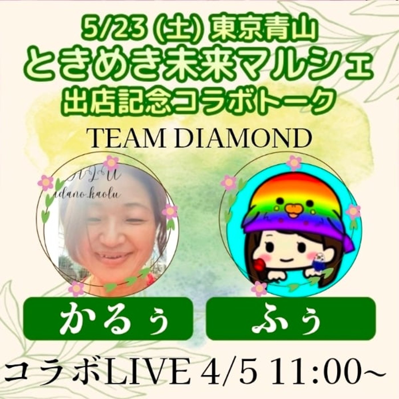 今日は、来月5月の23日にリアルマルシェ、ときめき未来マルシェに出店することにいたしたので、そのコラボLIVEをします。
