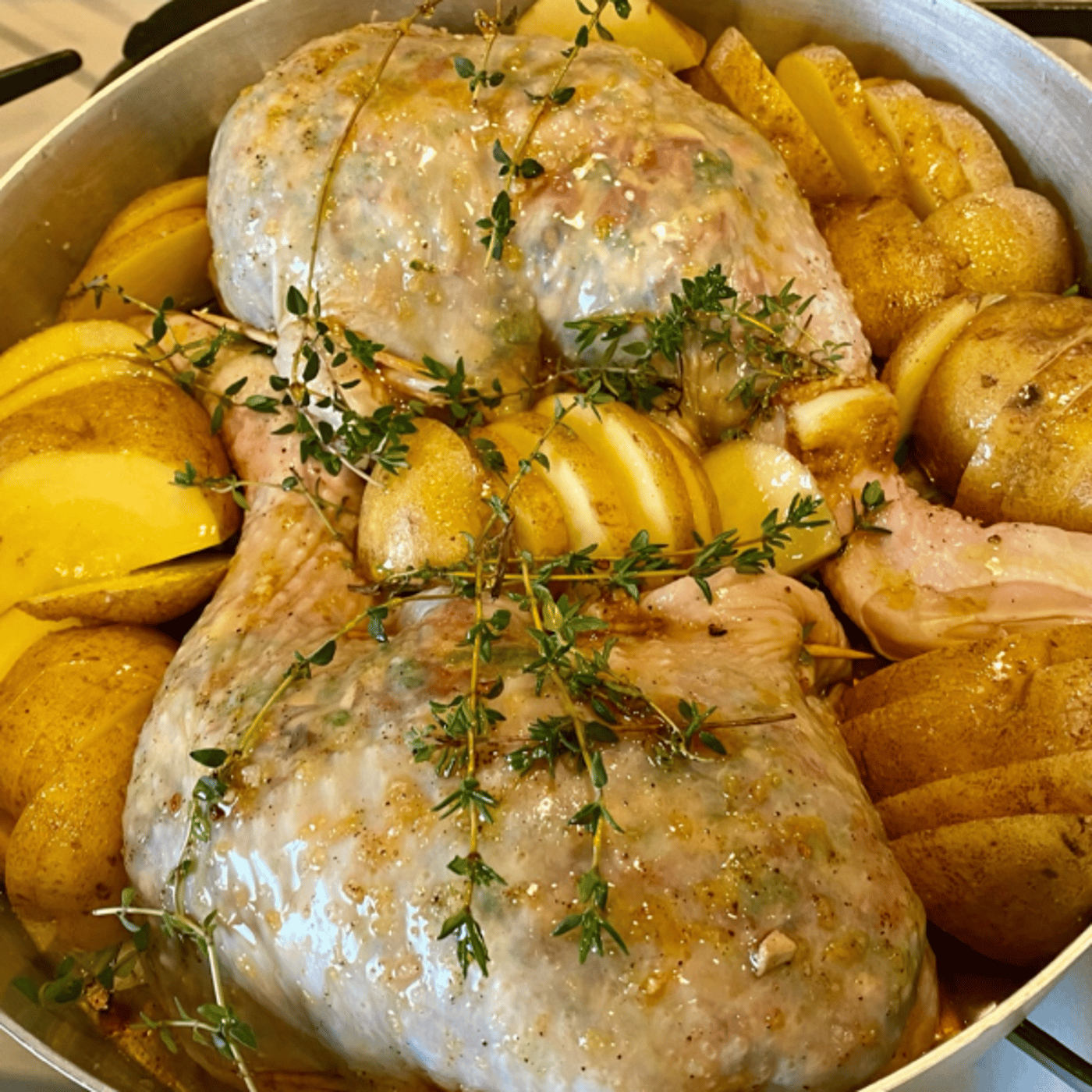 今日、私のクリスマスチキンは、手羽先餃子からヒントを得て、鶏ももの身と皮の間に具を入れてオーブンで焼くっていうのをですね、そんなに難しくないですよ。皆さんもできる。