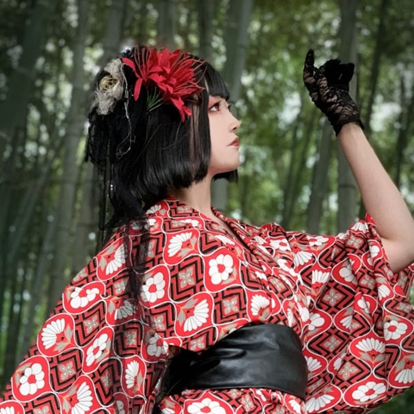 で、頭に彼岸場のお刺し。で、レースのね、ちょっとあの、スチパン風の紙飾りを持っているので、これを後ろにつけてます。