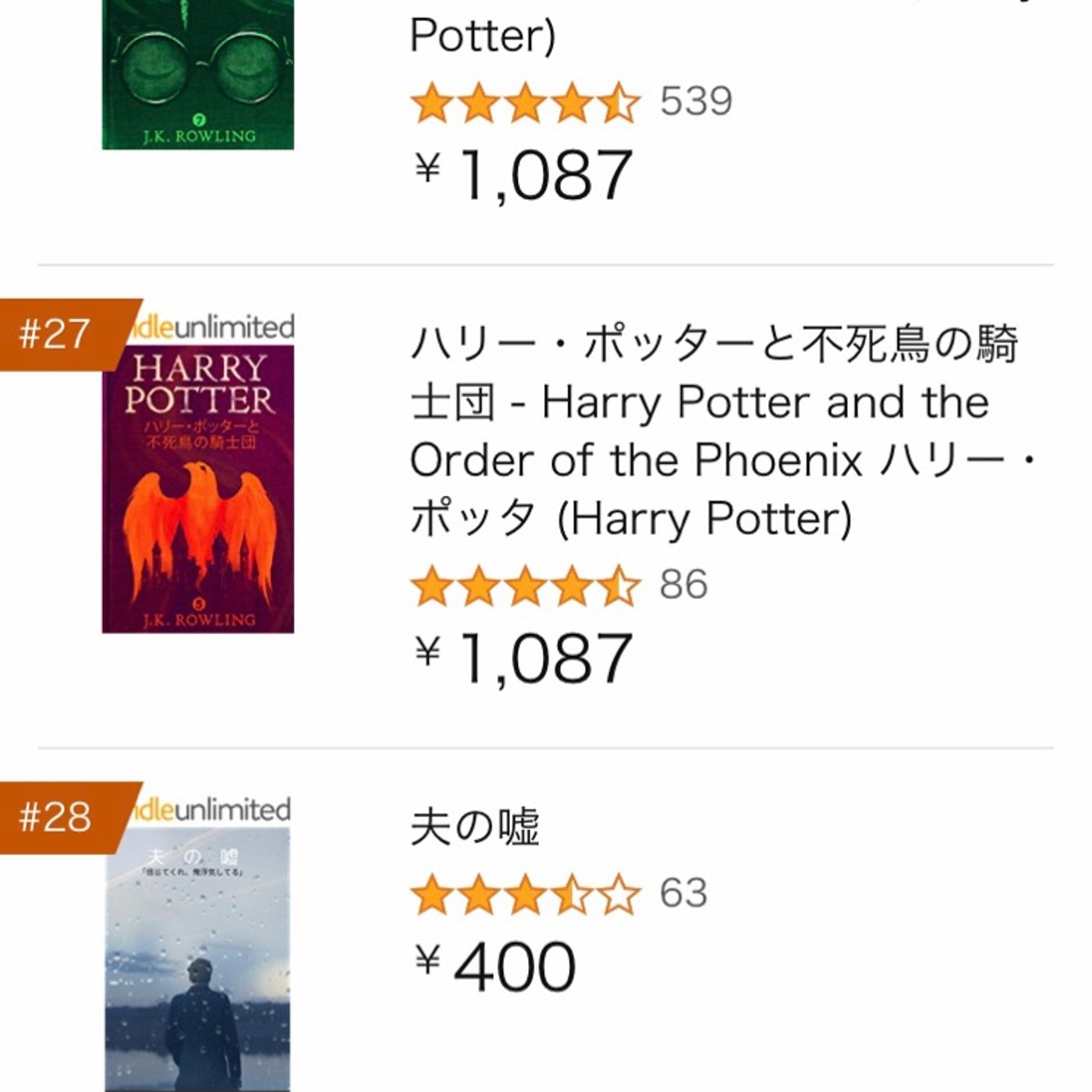 ハリーポッターがら27位です♪私の本「夫の嘘」が28位🤣すごくないですか!!村上春樹の本は5位!憧れの尊敬してる作家さんと同じ土俵にいる!って勝手に感動し、自分で自分を褒めてます😭 #夫の嘘#読書#Kindle本#小説