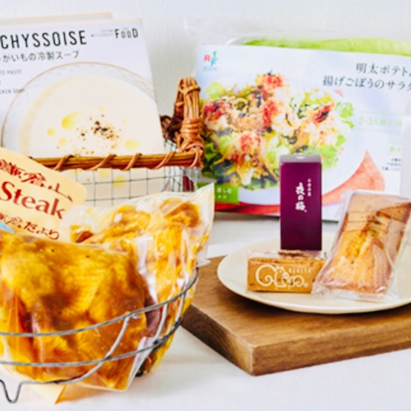 ローストチキン2個・ハンバーグ2個・ポテトサラダ・コーンスープ2個・とらや羊羹・フィナンシェ・くるみっ子