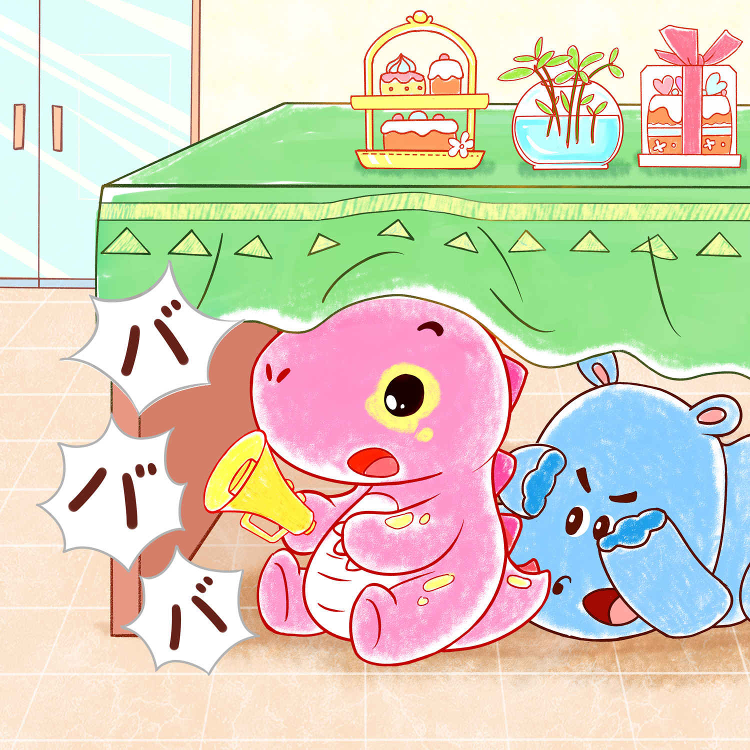 恐竜のブチは週末にモンブランを作るため、薄暗い栗の山の洞窟へやってきました。洞窟の中には栗が山ほどあります。ブチは大きな袋を取り出し、栗をどんどん詰めていきました。すると突然…下の方になにやら不思議な緑の箱が埋もれていることに気がついたのです。
