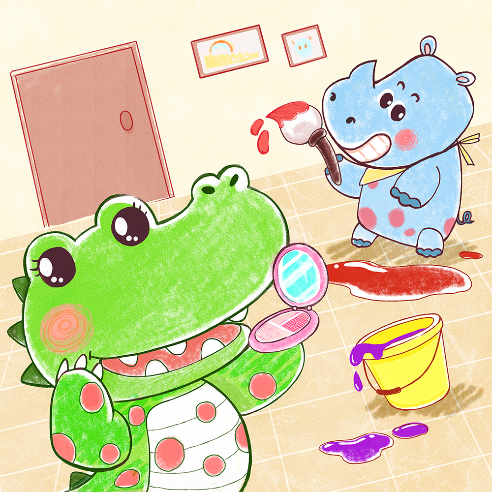 サイのゴウは、ブチの左目のまわりにある黄色くて丸い斑点を不思議そうに見つめています...