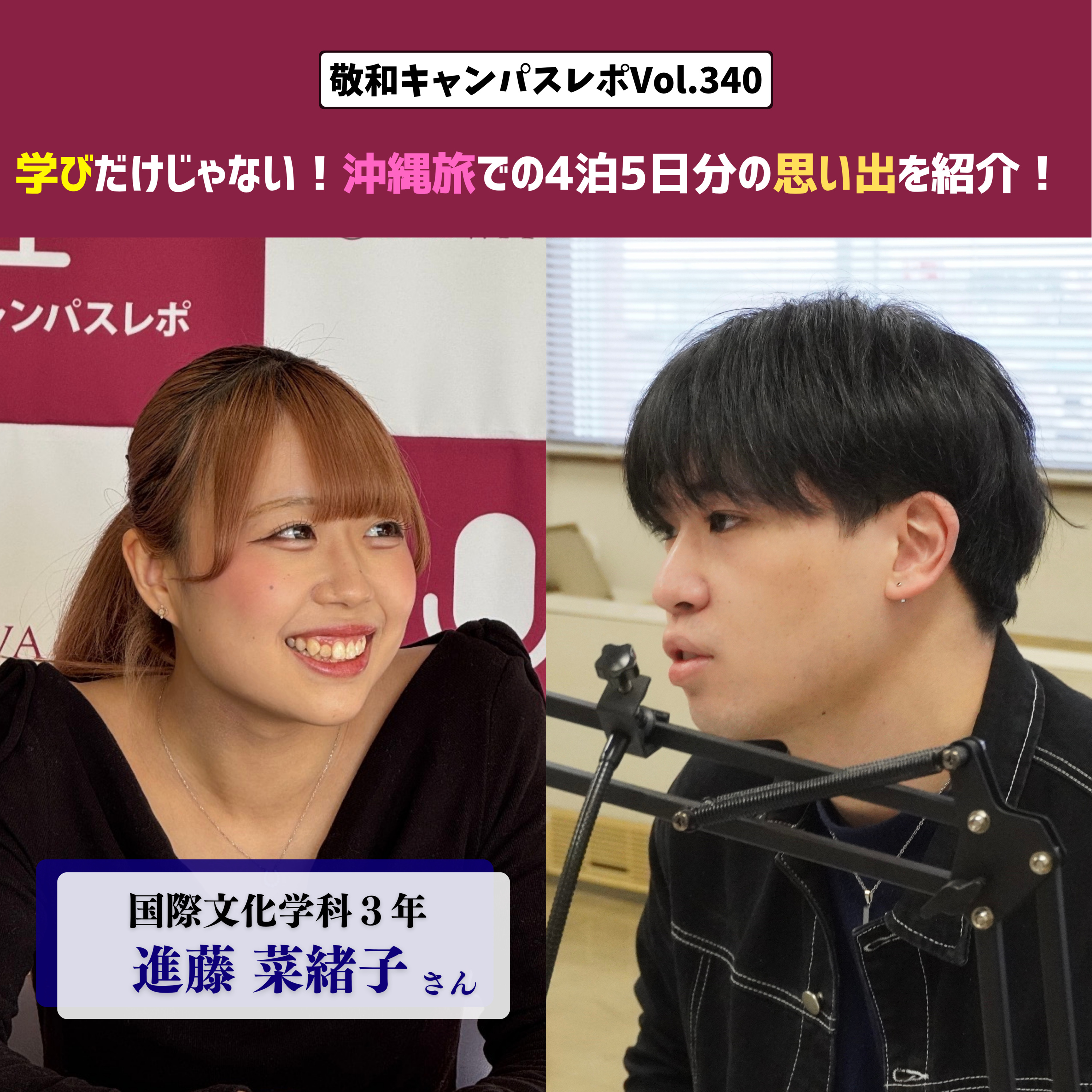 今日の敬和キャンパスレポは、敬和キャンパス機構として、沖縄での集中講義、情報メディア特論①、国内取材研修に参加した国際文化学科の富田風賀さん、一戸信哉先生とともにお話しする回、後半です。