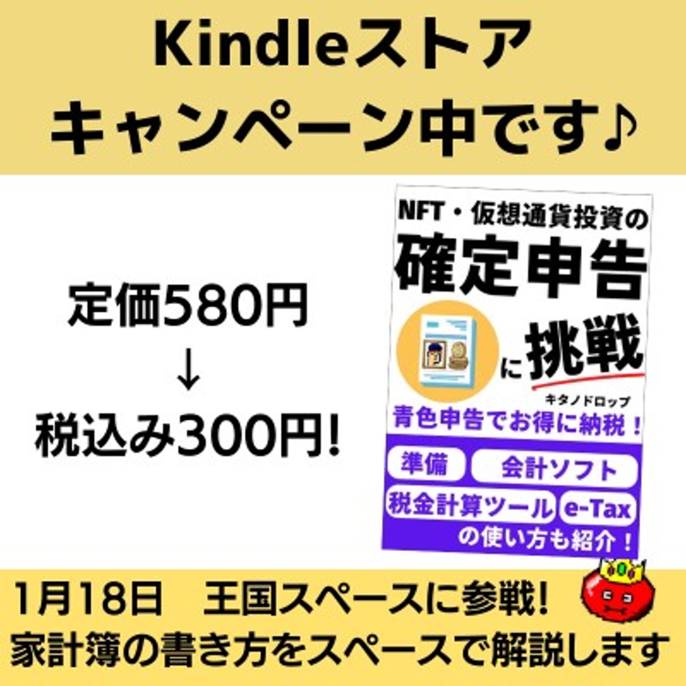 このキャンペーンに私のKindle本も参加しており、NFT仮想通貨投資の確定申告に挑戦という本が、税込580円のところ、今だけ300円で購入できます。