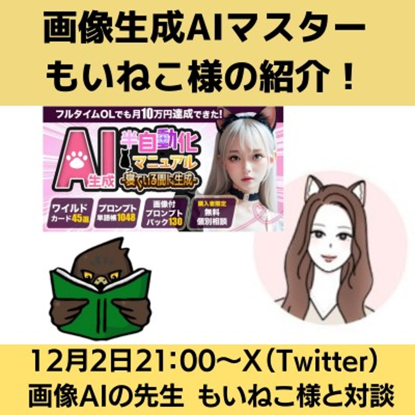 今日は12月2日の夜9時からインタビューさせてもらう、画像生成AIの使い方を極めつつあるもいねこさんを紹介させてください。