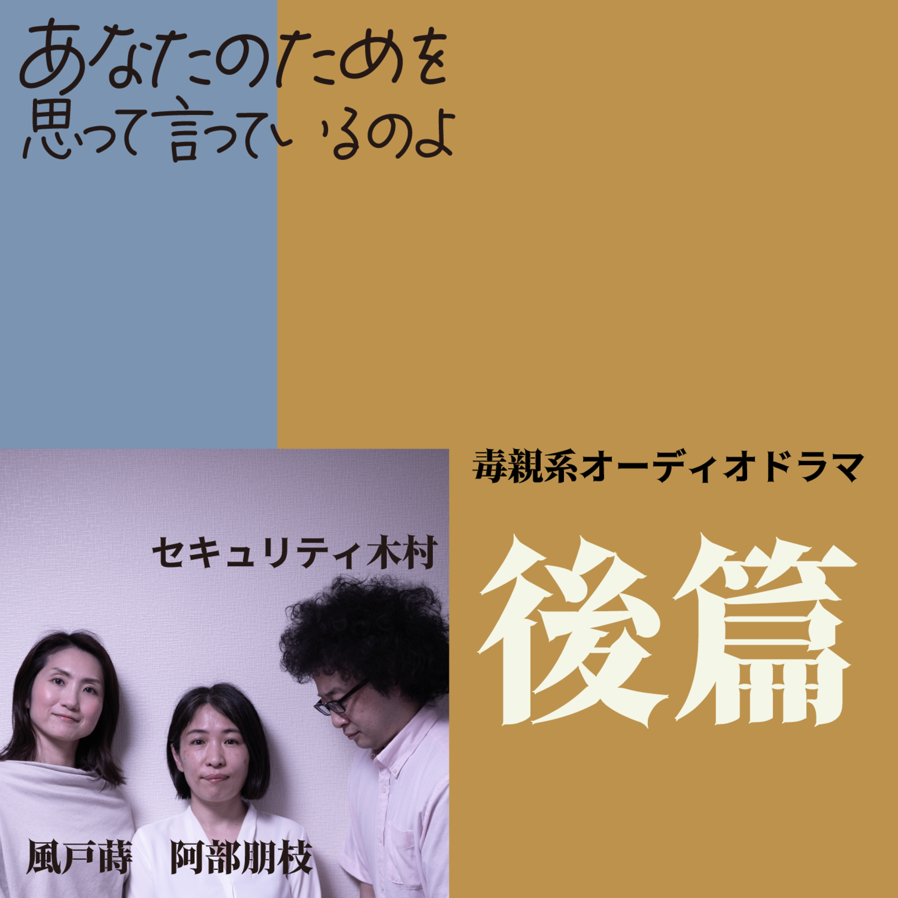 毒親系オーディオドラマ「あなたのためを思って言っているのよ(後篇)」出演:風戸蒔(毒親涼子)、阿部朋枝(涼子の娘エツコ)、北澤友梨枝(シリクサ)、セキュリティ木村(執事キムラ)、森下和(デート相手カツオミ)、宮川賢(カツオミの父マコト)、山梨谷梨(絡む男)、つん★つん(カツオミの祖父)、大津ワイン(デート相手タネイシ)、笹沢裕子(店員)