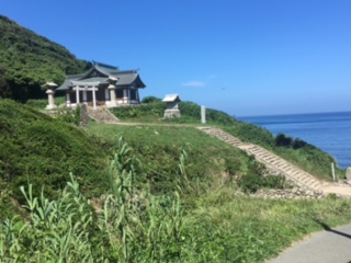 そして、島の反対側に回りますと丘の上に沖津宮遙拝所があり、ここから遙か遠くに見える沖の島の沖津宮を拝むのです。