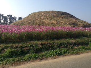 古墳の回りには赤・白のたくさんのコスモスの花が満開です。