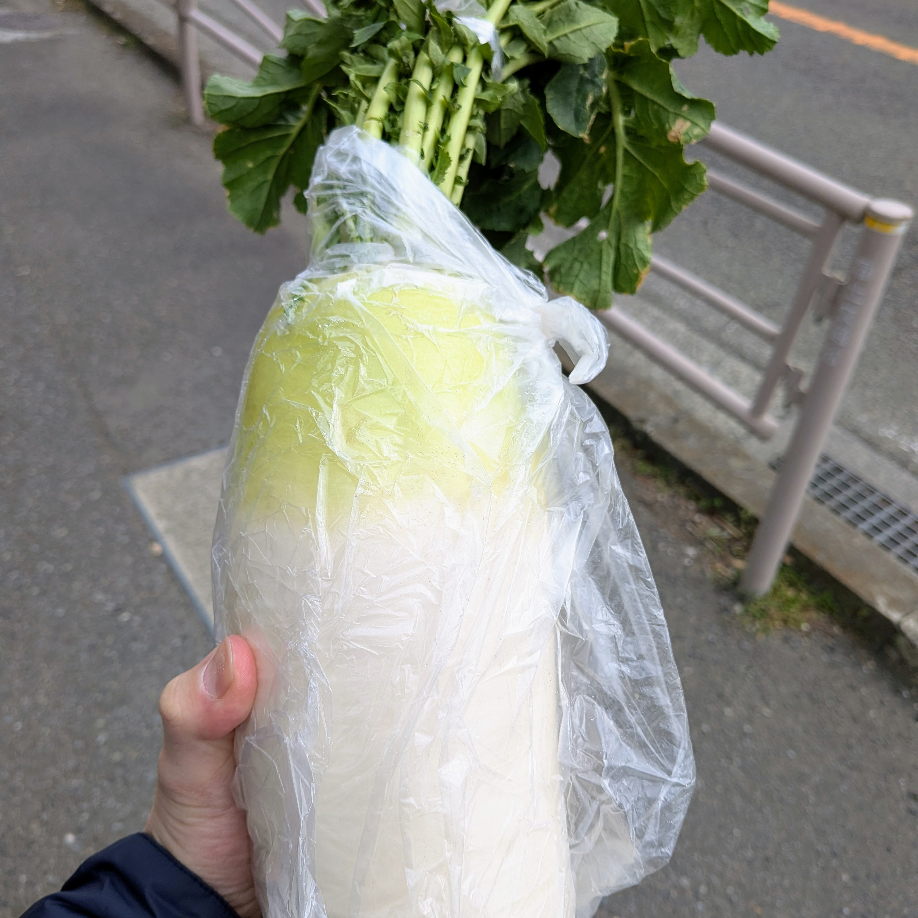 今、手に立派な葉っぱもいっぱい付いた大根1本、まるまる200円で買ってきて、