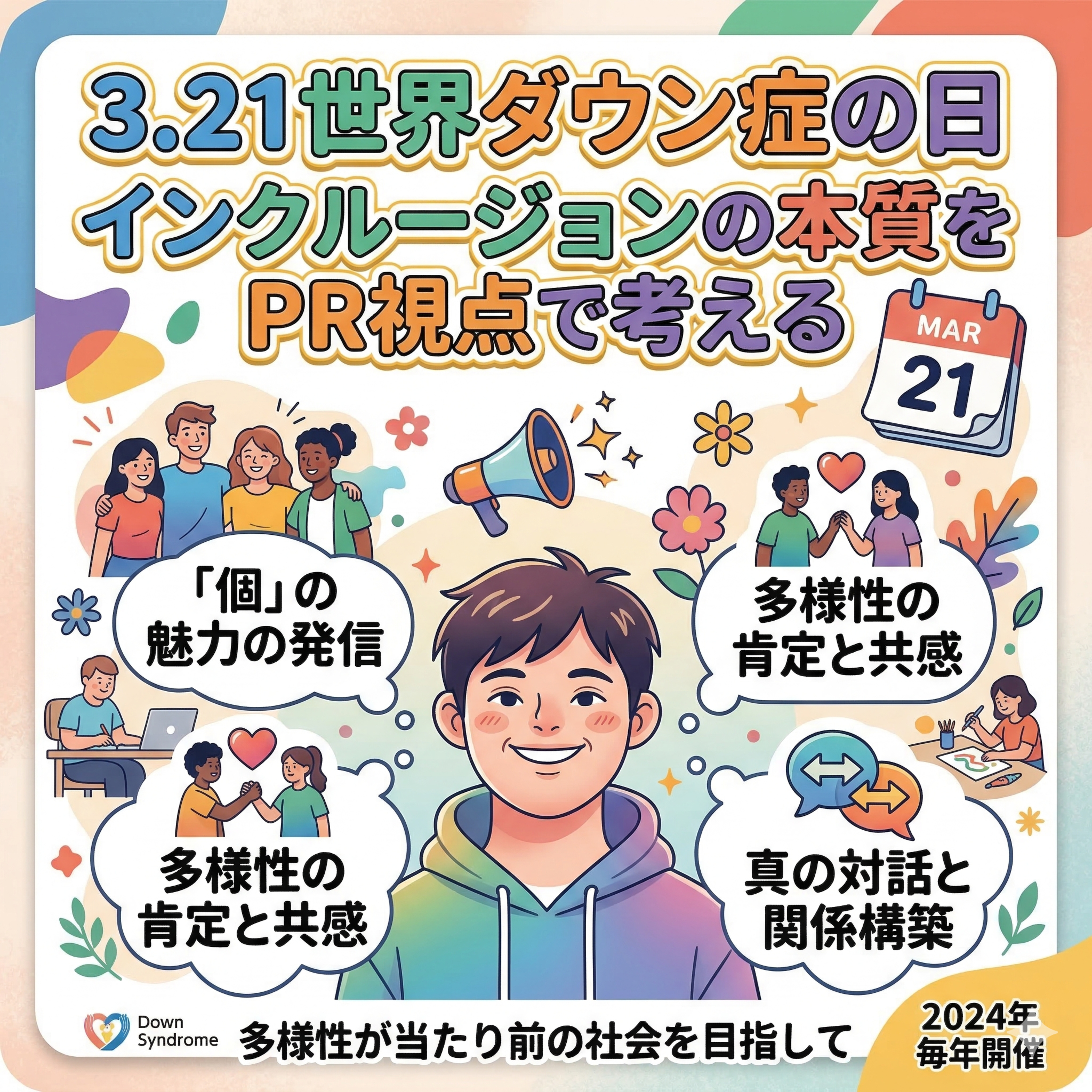 3月21日は「世界ダウン症の日」/ダウン症は珍しい存在ではない/出生前診断と現実のギャップ/ダウン症とともに生きる日常/医療の進歩で変わった寿命/課題は「孤独」と社会構造/インクルージョンという考え方/PRが社会を変える力になる/これからの社会と企業の役割/「共に生きる社会」へ