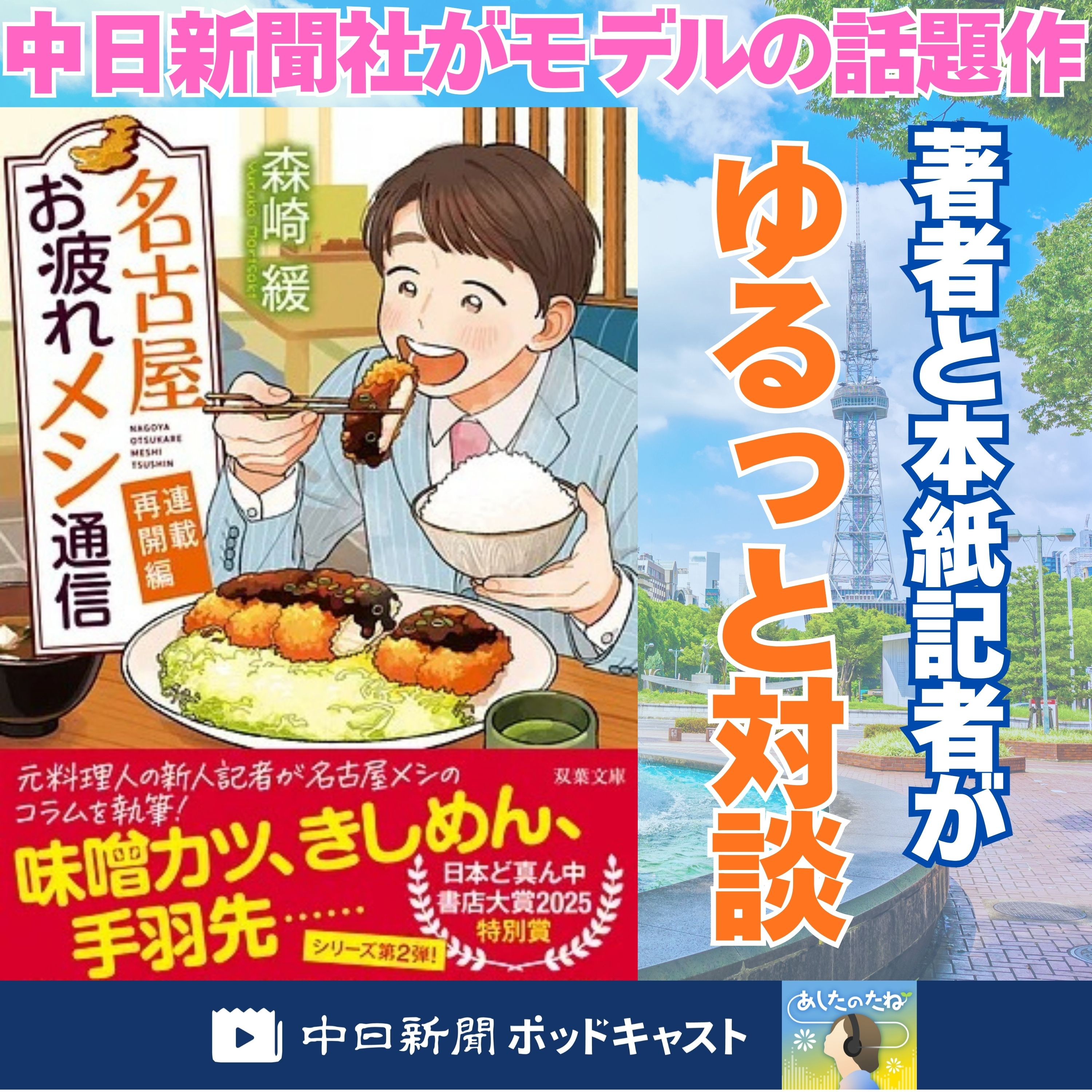 新米新聞記者が名古屋めしを題材にした連載コラムの執筆に奮闘する小説「名古屋お疲れメシ通信」(双葉文庫)の続編が刊行されました。今回は、著者の作家森崎緩さんと、森崎さんが小説執筆のために中日新聞社へ取材に訪れた際、案内役となったデジタル編集部・植木創太記者との対談をお届けします。