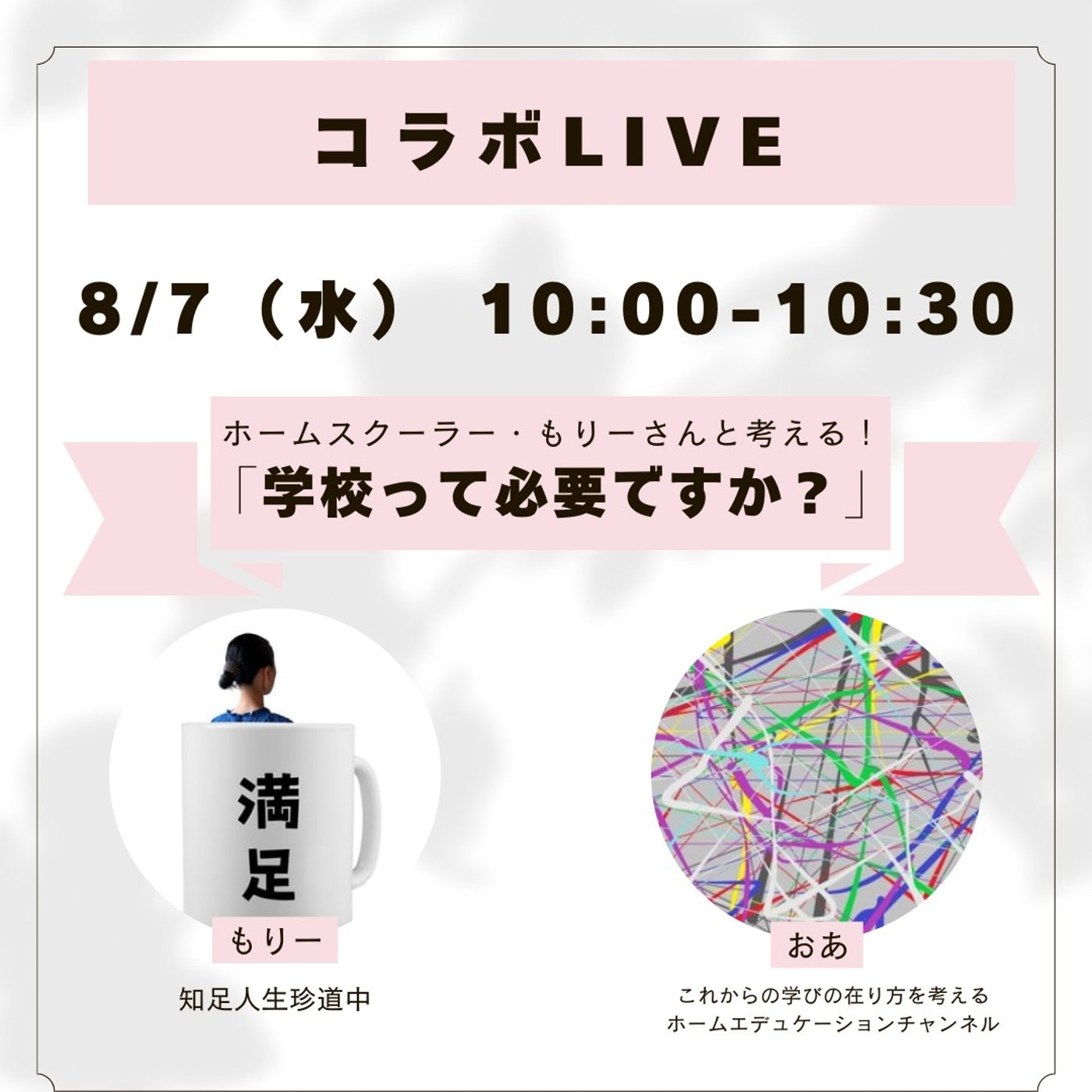 はいというわけでもう一度8月7日水曜日10時から10時30分にホームスクーラー森さんと学校って必要ですかというテーマでコラボライブをいたします。