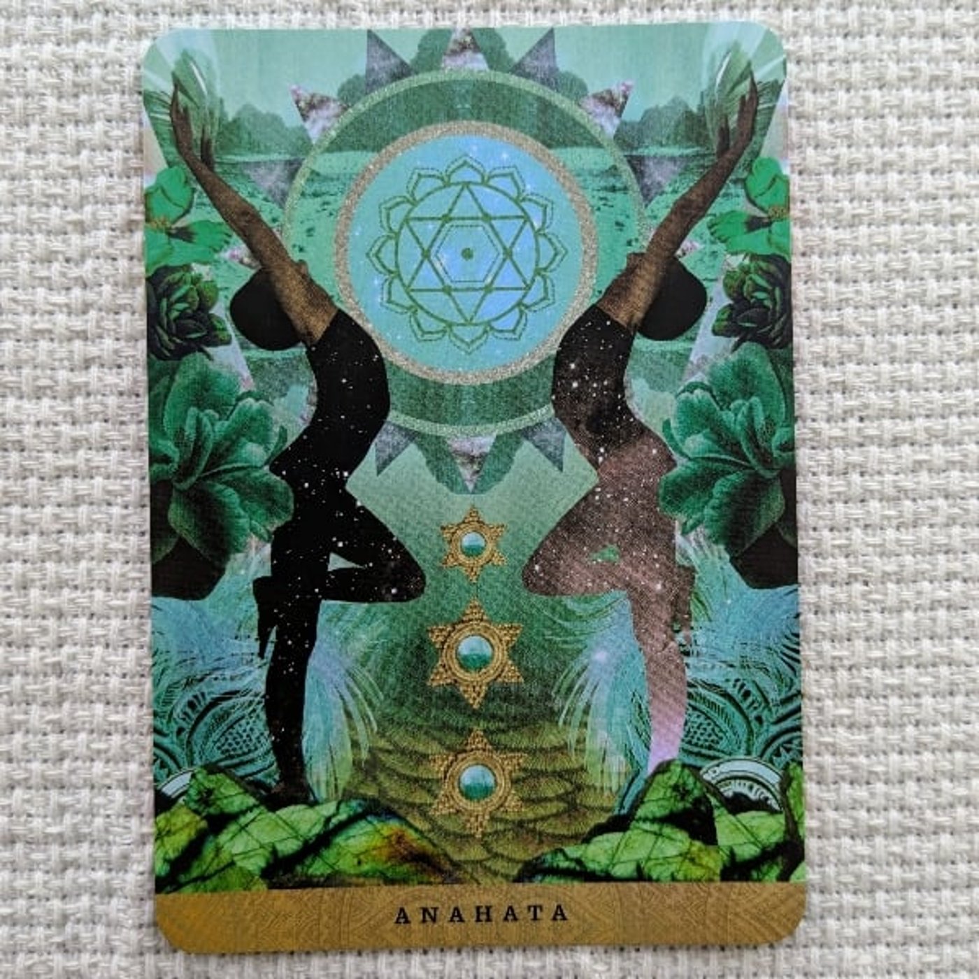 アナハタチャクラっていうのは、胸のチャクラ、胸にかっしゃみたいにくるくる回っていて、生命エネルギー、ヨガでいうところのプラアナっていうものをくるくる回している、全身に行き渡るように回しているチャクラのうちの1つ、アナハタチャクラというカードです。
